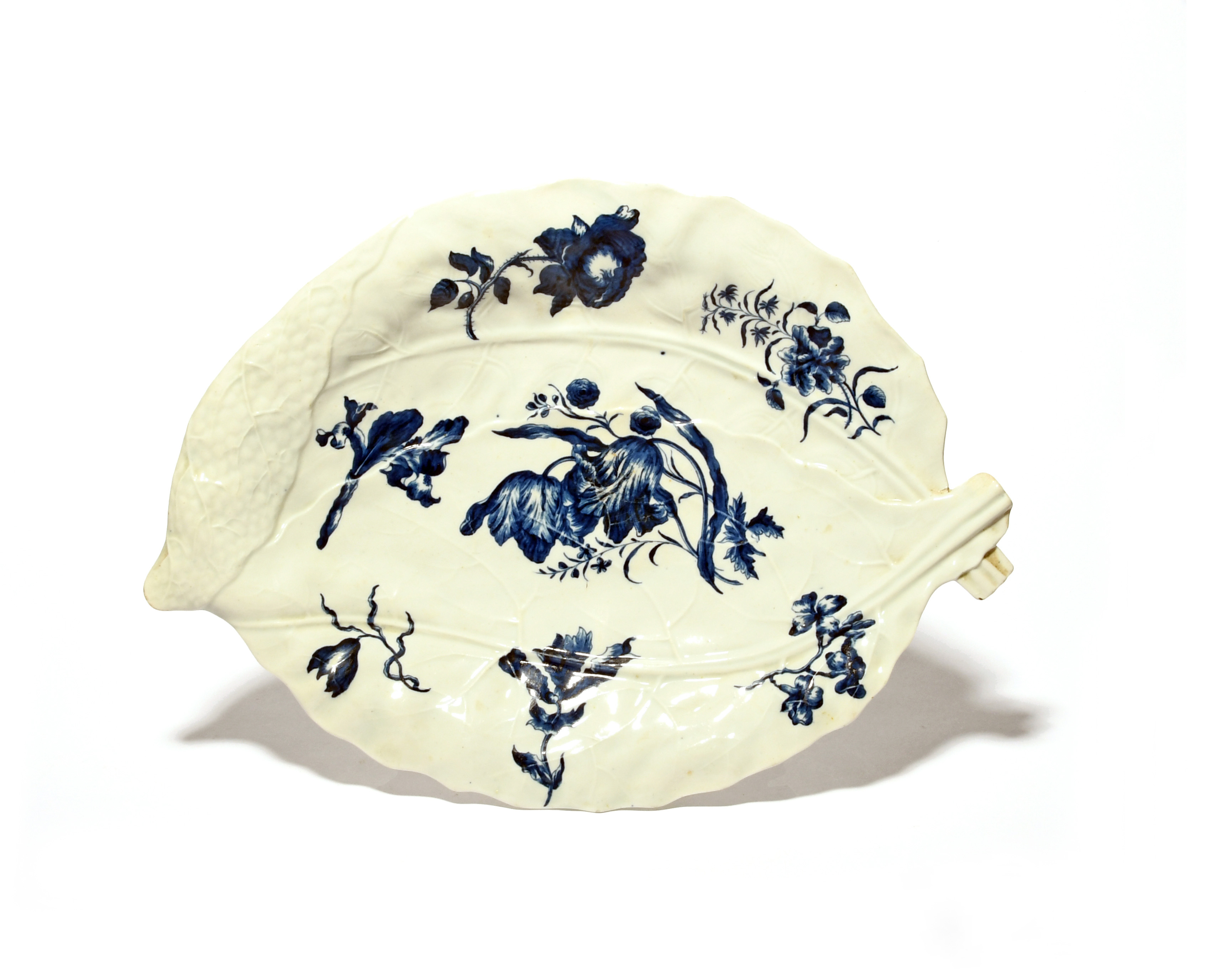 A large and rare Worcester blue and white leaf dish, c.1758-60, formed of two overlapping cos