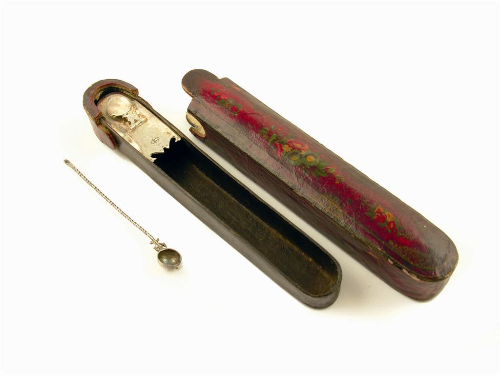 A Persian papier mache oblong scribe box, with floral and gilt decoration, the interior with a lidded silver coloured metal well, 9in (23cm) l.