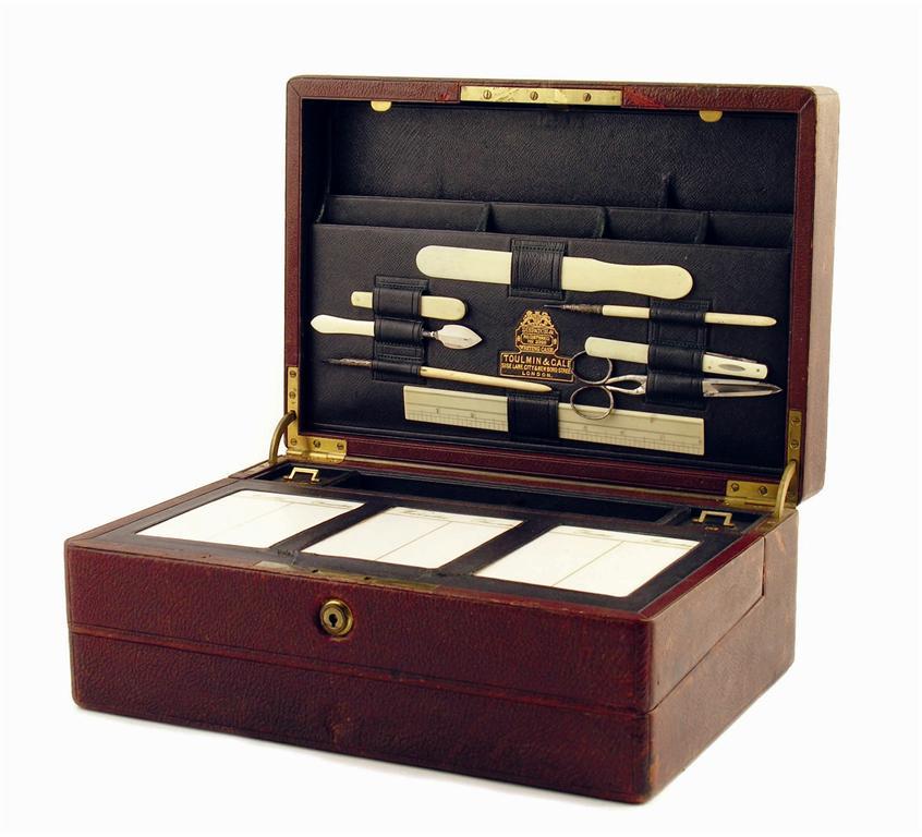 A late Victorian leather writing slope by Toulmin & Gale, the lid initialled 'E.H,' to a fitted interior with ivory and steel accoutrements and gilt tooled 'TOULMIN & GALE, SISE LANE CITY & NEW BOND STREET LONDON, DISPATCH & WRITING CASE REGISTERED No. 3395,' the hinged slope fitted three ceramic tablets, divided 'Monday to Saturday,' to 'Light' and 'Ink' boxes and further covers with watered green silk panels and a blotter book, the Bramah style lock has been cut, 6in (15cm) h, 14in (35.5cm) w, 10in (25.5cm) d.