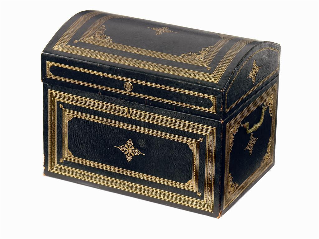 A leather covered small domed trunk, with gilt tooled decoration and a rondel with arabic script, 14.25in (36cm) h, 18.25in (46cm) w, 13in (33cm) d.