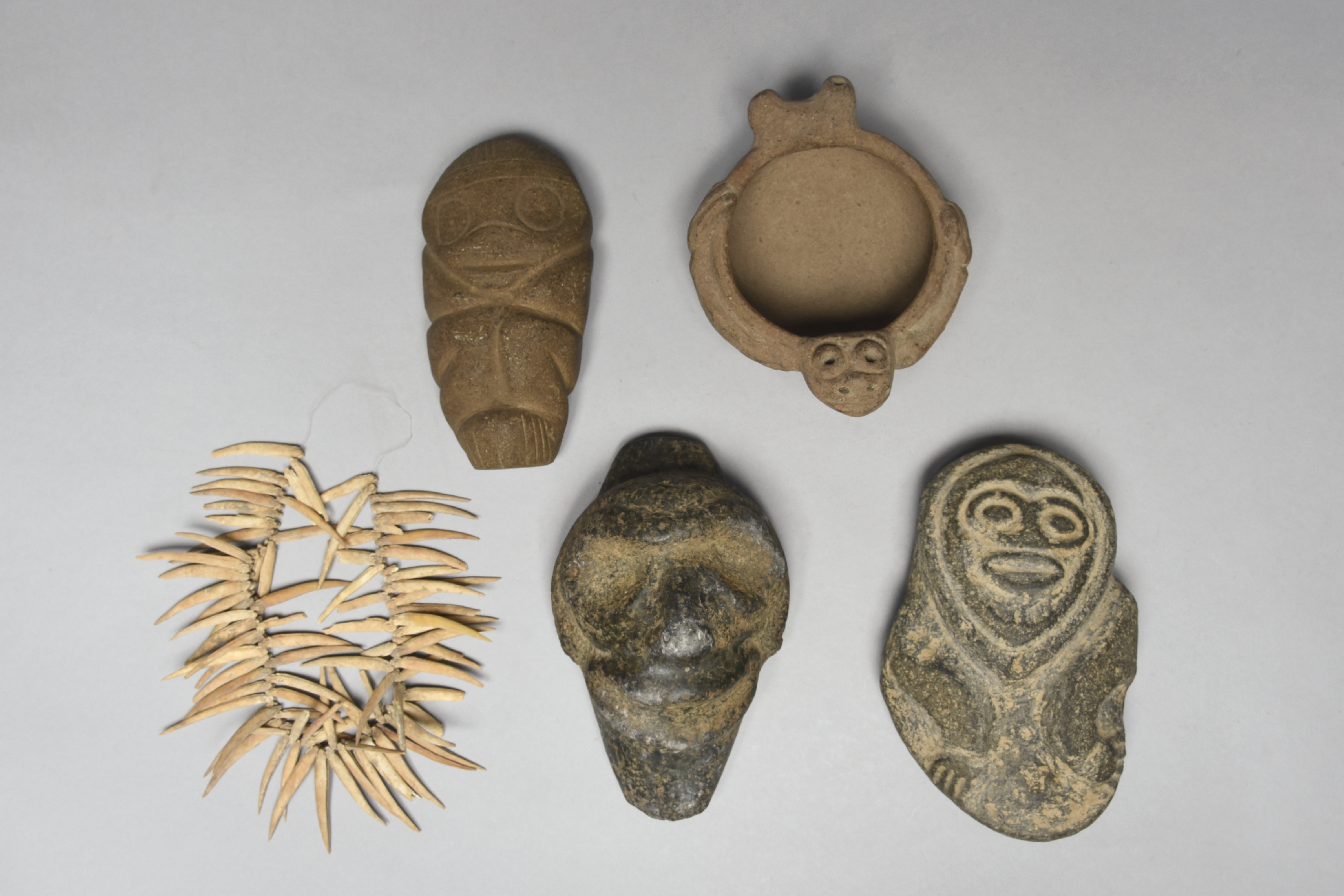 two Taino stone figures, Caribbean, circa 1200 - 1500 AD, 16.5cm and 18.5cm high, a Taino pottery manatee bowl, 16cm long, and a Taino fish bone necklace, circa 1100 AD. (5)