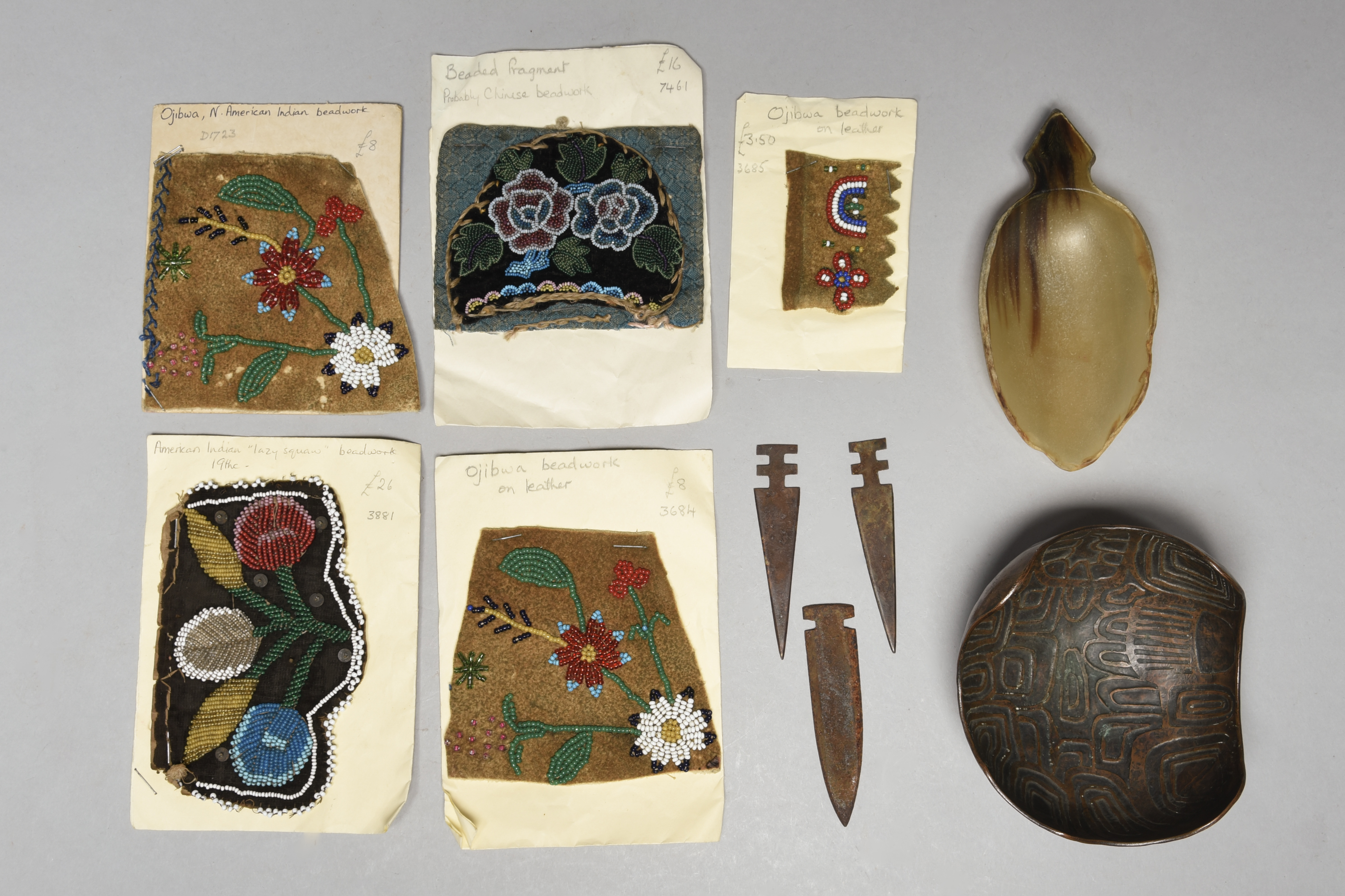 a horn scoop, three Sioux metal arrow heads, and a copper bowl with abstract relief designs to the interior, 11cm wide. (10)