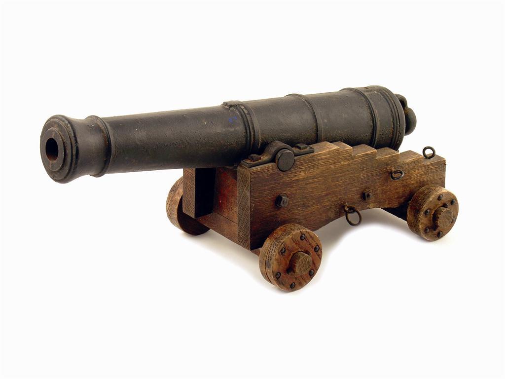 An iron model cannon, on an oak carriage, 7in (18cm) h, 15.5in (39cm) l.