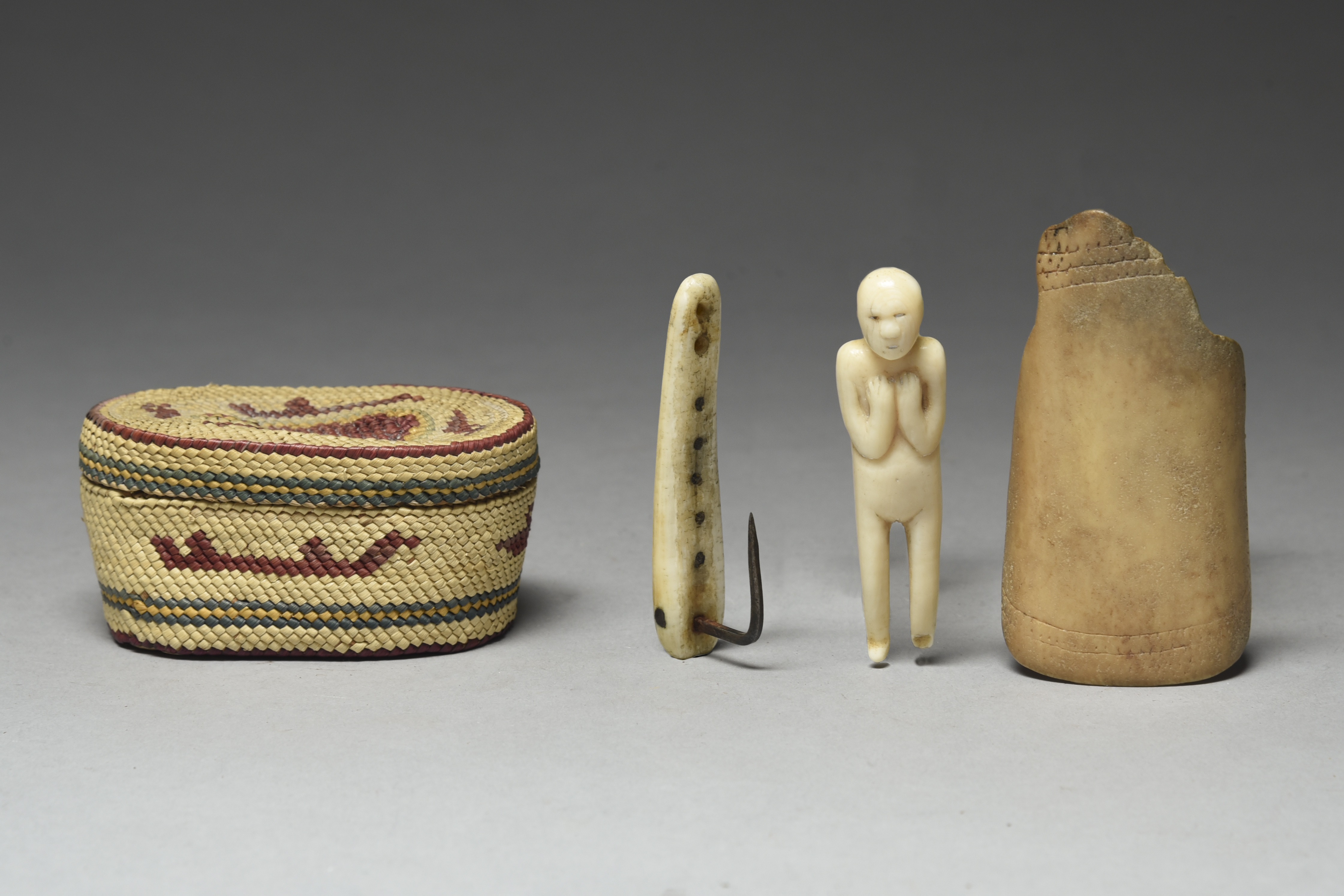 an Inuit fish hook, walrus ivory, baleen and a nail, 7.8cm long, an Inuit marine ivory wrist guard fragment, 9cm long and a Nootka small oval basket and cover, 9cm. (5)