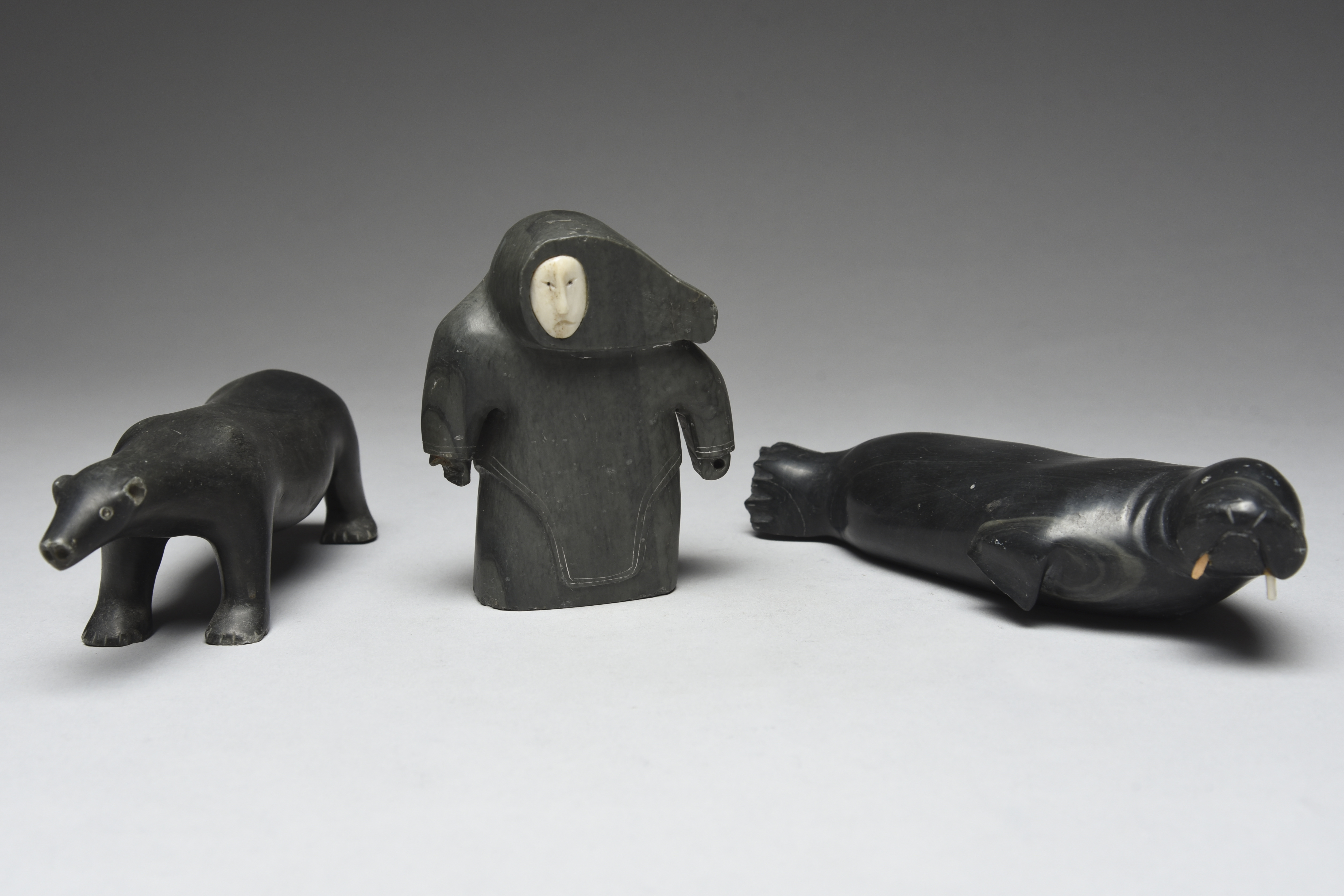 an Inuit steatite model of a Walrus, with a bone tusk and a replaced wood tusk, 22.5cm long, and an Inuit stone figure of a hunter, with a walrus ivory inset carved face and wearing a parka, 11.5cm high. (3)