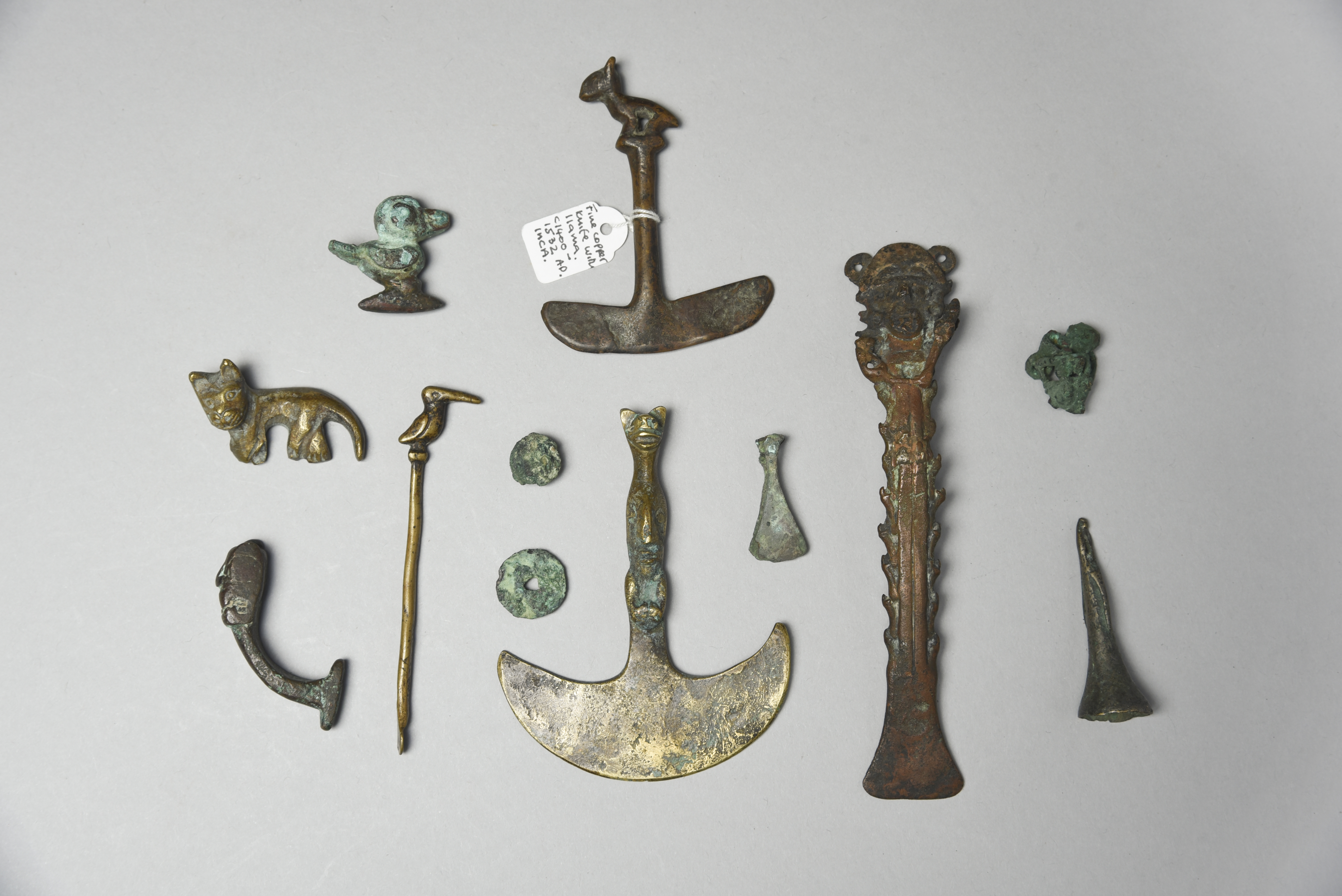 an Inca cast brass tumi, depicting a figure with a jaguar head finial, 8.7cm high, an Inca cast bronze condor mount, 2.7cm high, a Moche cast bronze atlatl thumbpiece, with a jaguar head terminal, 3.2cm high, a Moche cast brass spatula, with a bird finial, 8.37cm long, a Moche cast copper tumi, with a figure finial wearing a headdress and holding a staff, 13cm high, and six metal ornaments, including a set of tweezers, a feline, a trumpet shape pendant, a disc bead, incised linear scrolls, a finial with a head and bells, and a sphere. (12)