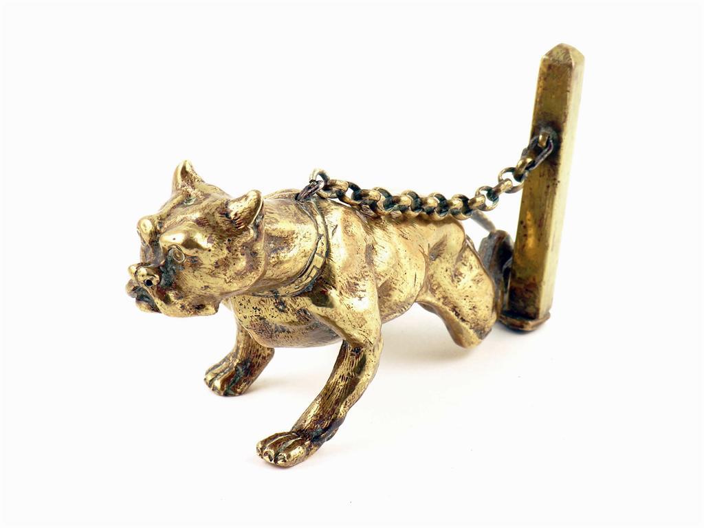 A gilt bronze model of a dog, tethered to a post, 2.75in (7cm) h, 5.25in (13cm) l.