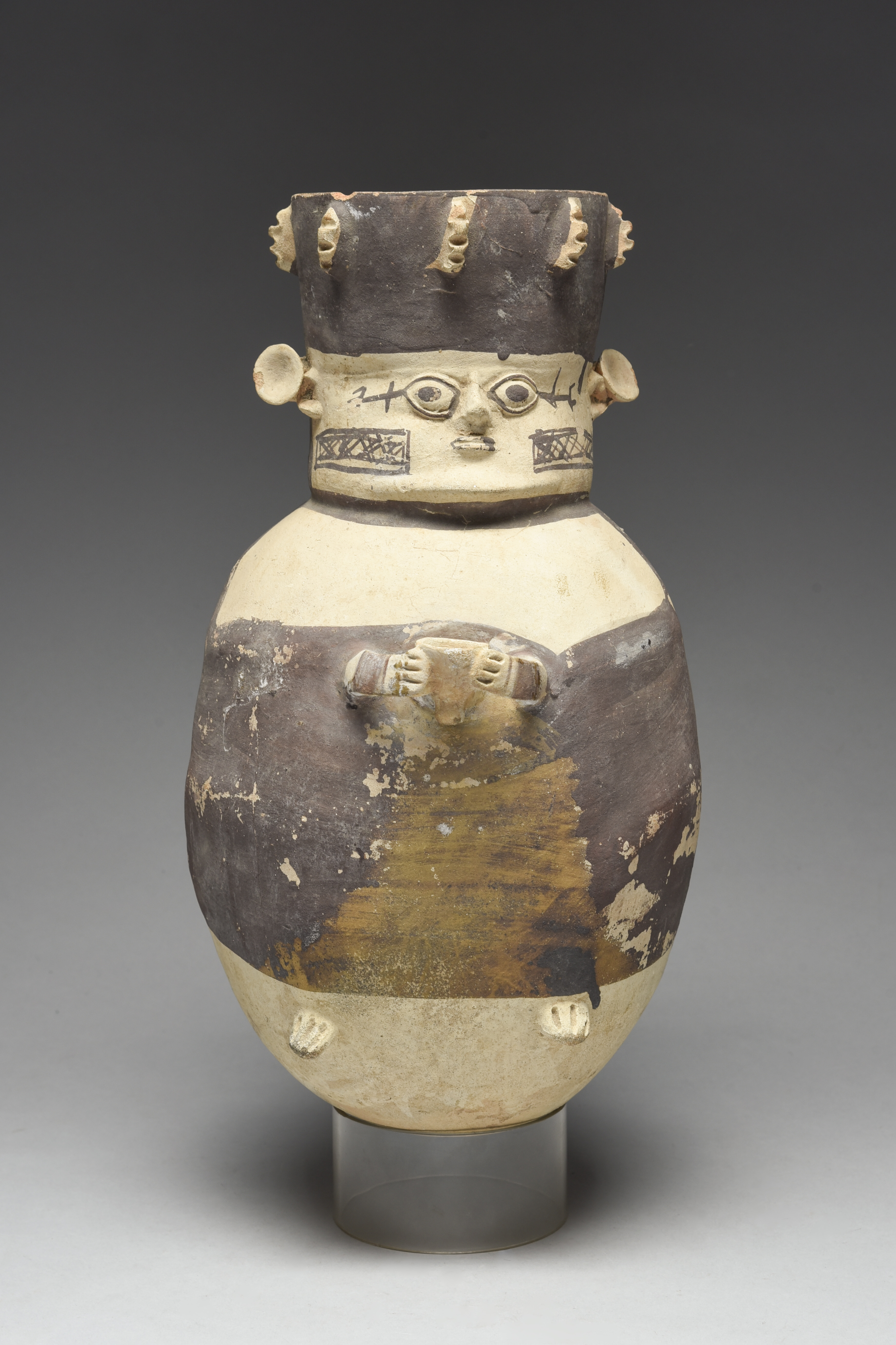 ceramic with cream and purple/brown slip decoration, modelled with a headdress, spool earrings and holding a cup,