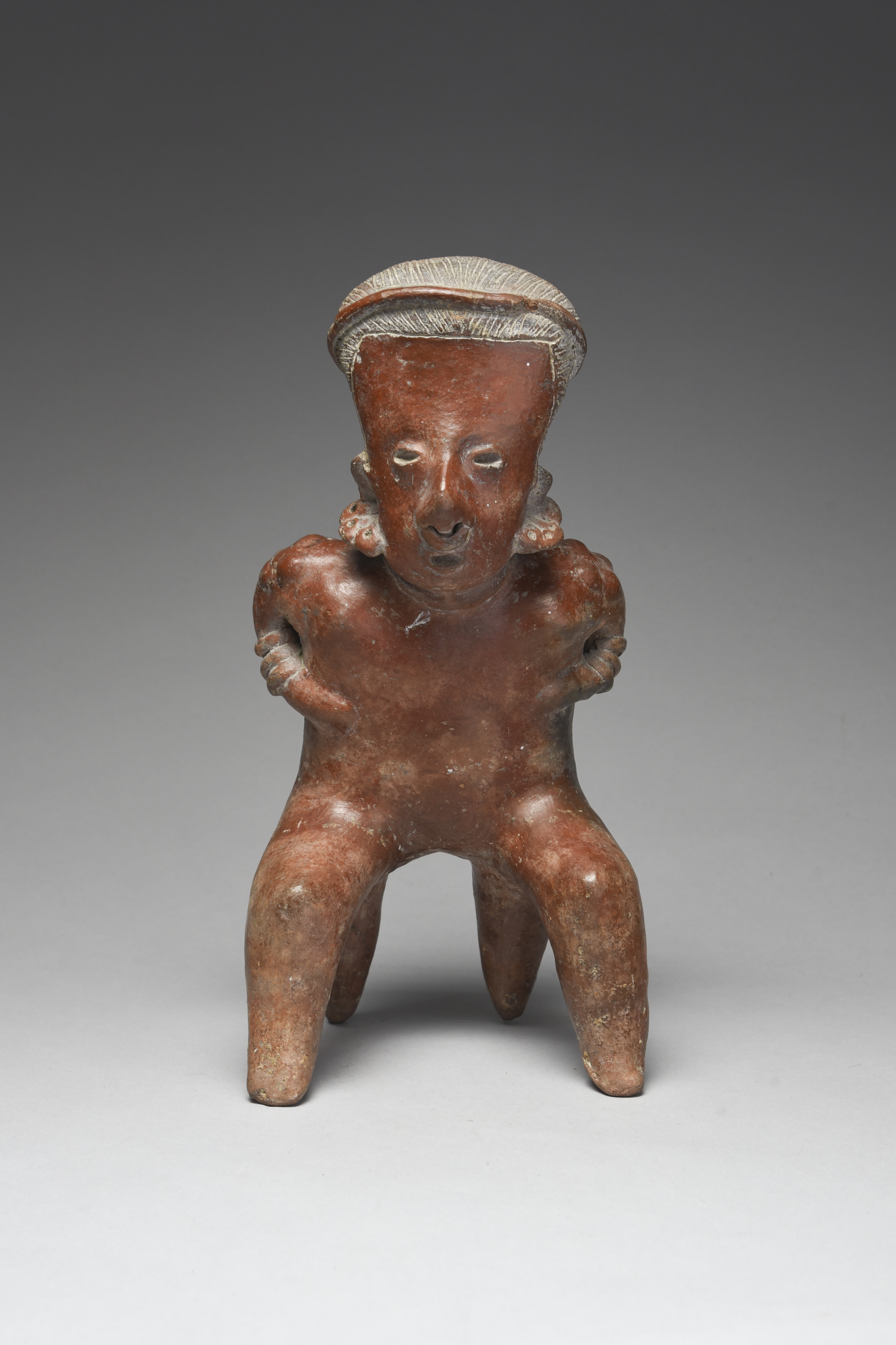 pottery, with a headband and aperture to the top of the head, wearing ear and nose ornaments, bangles and with nodules to the shoulders, on two conical supports,