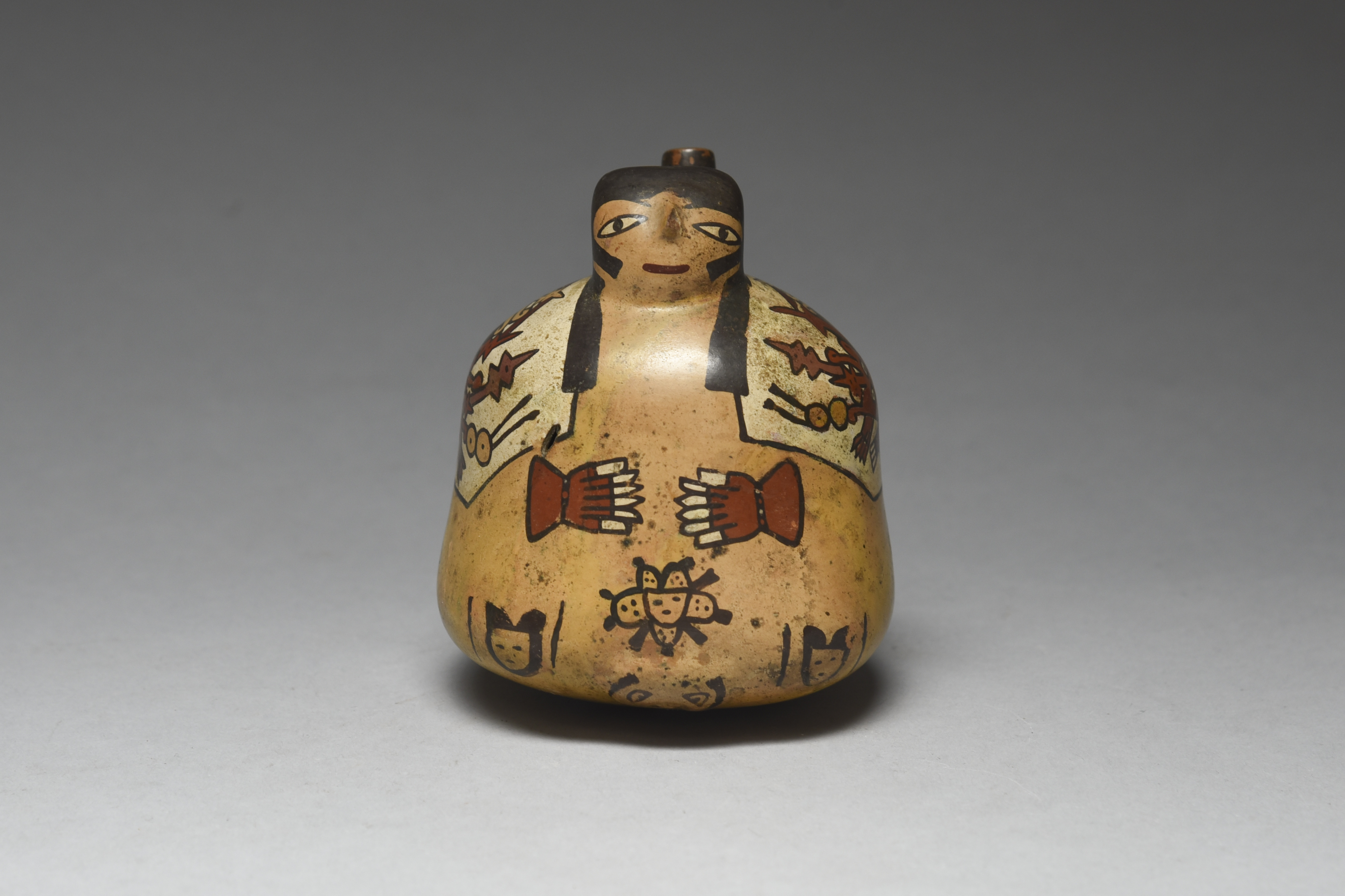 pottery, with a spout linked to a woman's head, with painted decoration including a pair of six fingered hands, two panels with a masked figure with multiple heads, the lower section with further heads and flying beasts,