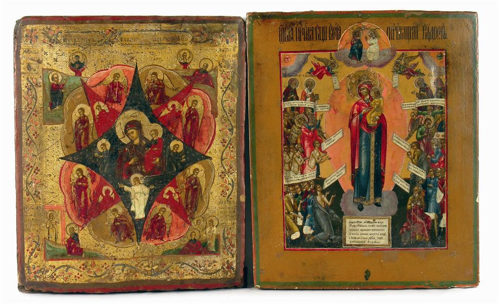 A 19th century Orthodox icon, centred The Virgin Mary with infant Christ, surrounded by prophets, 12.5 x 10.25in (31.5 x 26cm) and another with a foliage decorated border. (2)
