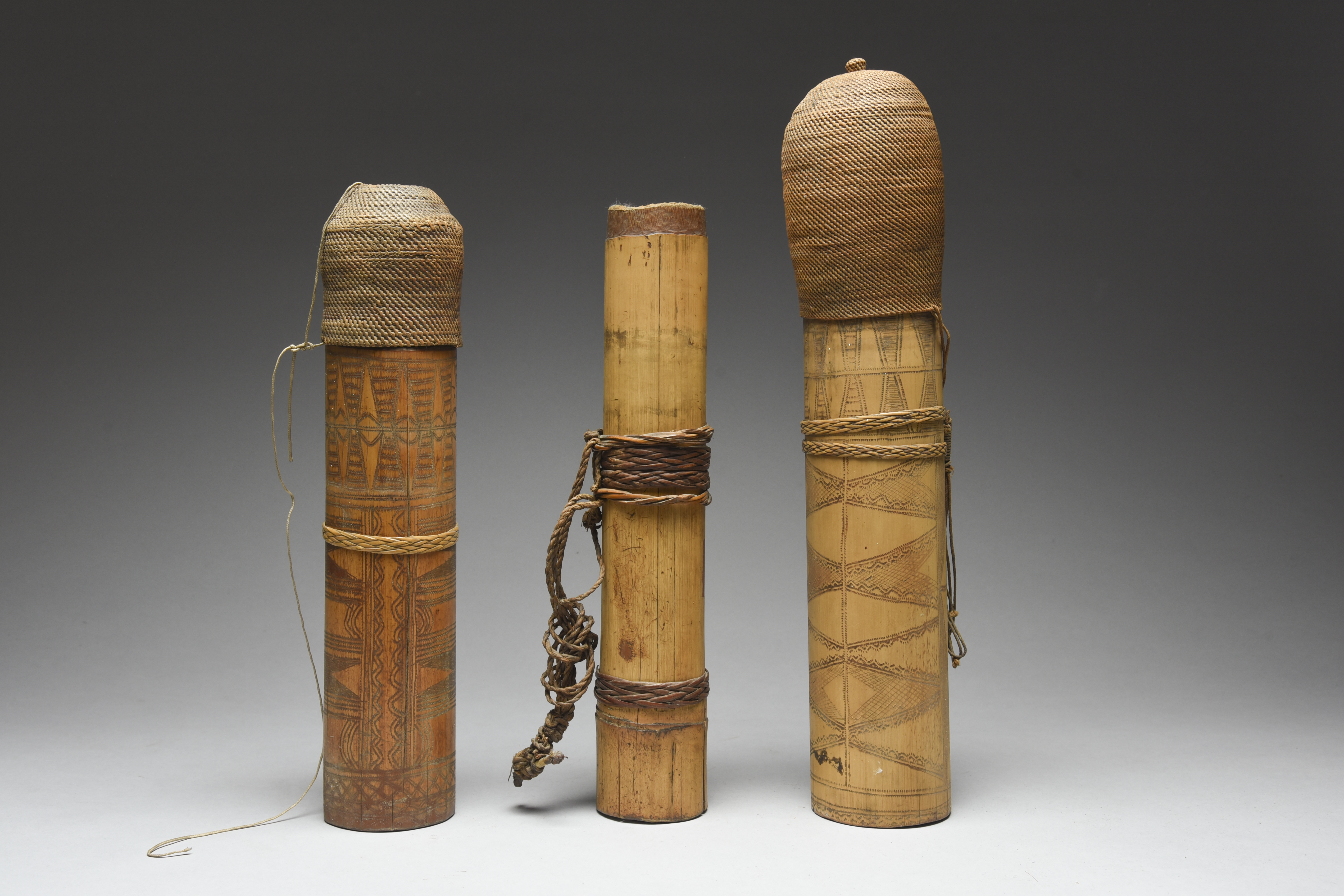 bamboo, with rattan bindings, two with incised decoration and rattan lids, two containing darts,