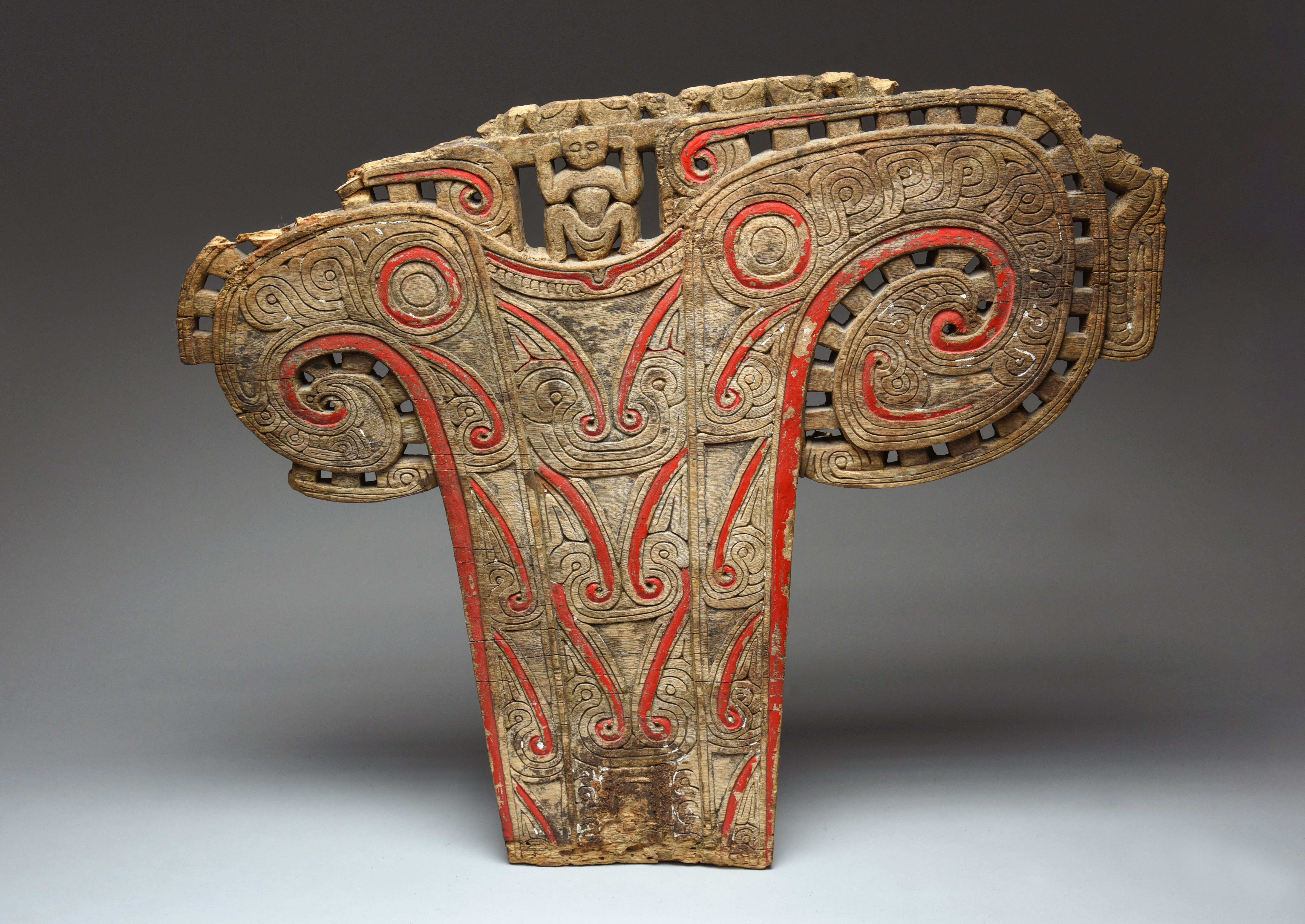 with a carved squatting figure and stylised bird scrolls, with remains of white and red paint,