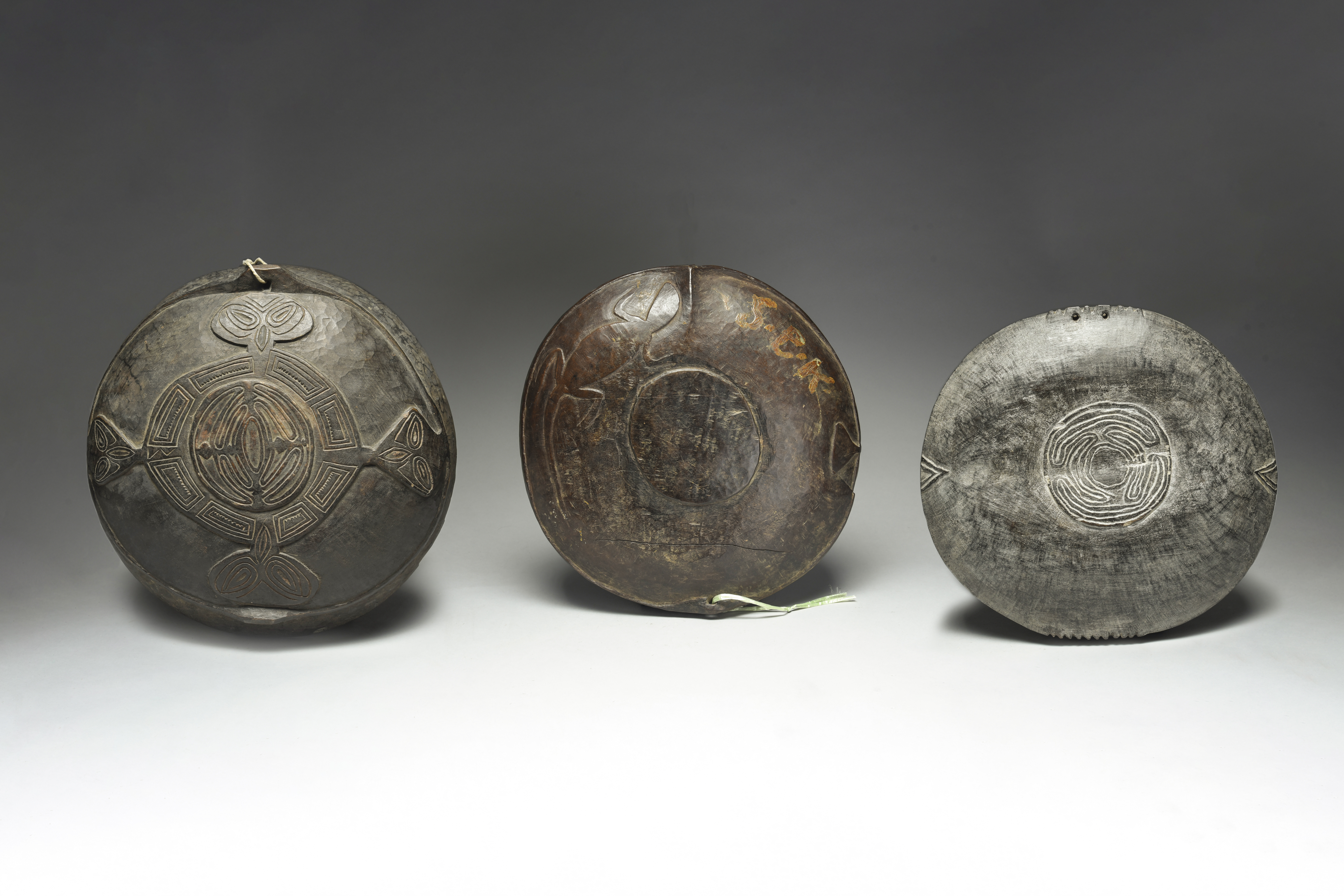 one with a relief carved line around the edge, a fish tail and a lizard, pierced for attachment and painted with initials s.e.k., 42.5cm diameter, another with relief carved geometric designs and masks, pierced for attachment, 45cm diameter and the third with a central circle design and two triangles, pierced for attachment, 42.5cm diameter. (3)