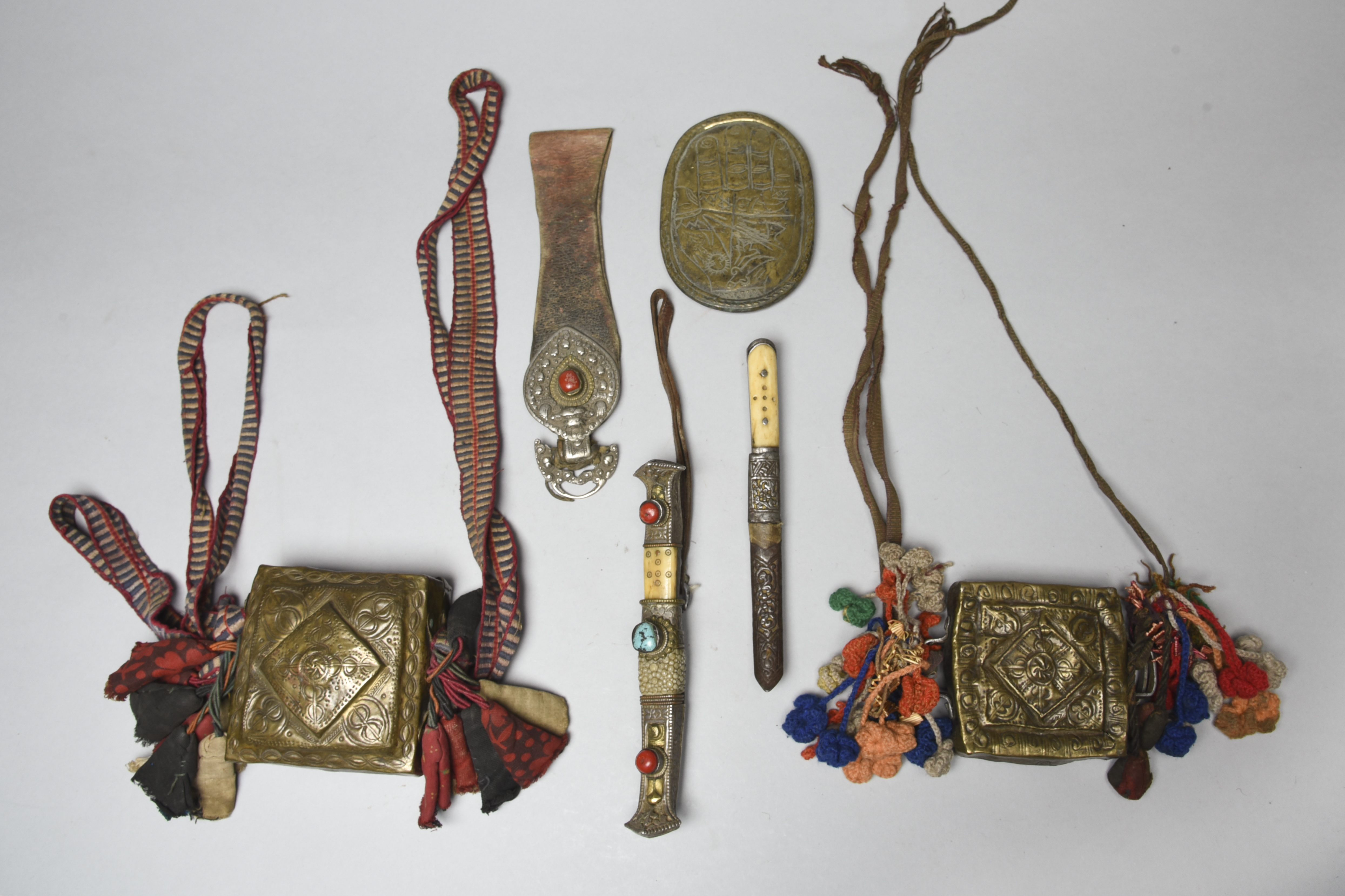 a plainer Tibet knife and sheath, 20cm long, two Tibet brass amulet boxes with fabric attachments and one with a folded Mandala, a Tibet belt strap, leather, brass and silver coloured metal with a coral bead, 25cm long and an oval brass cover decorated a hand with symbols, 14cm long.