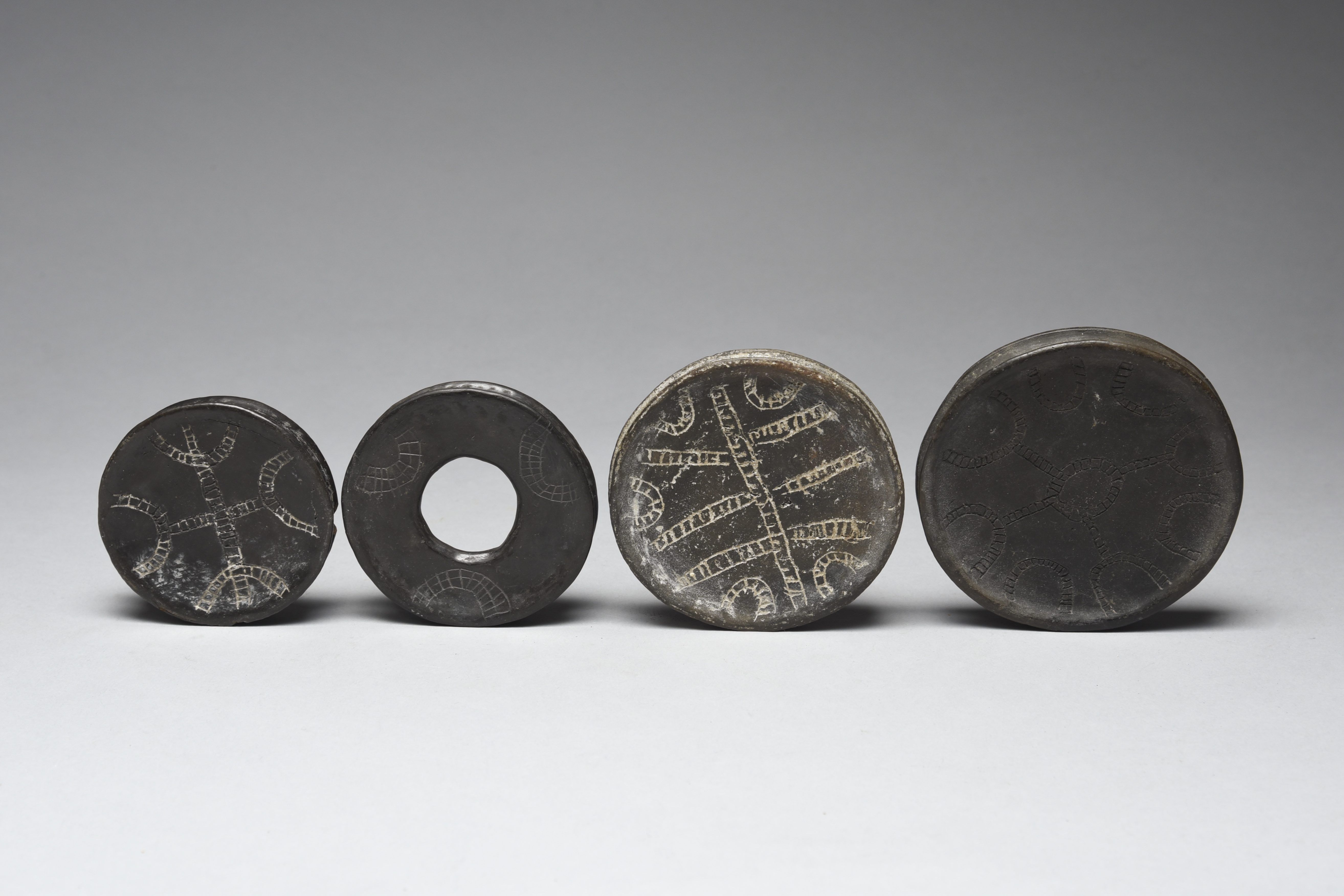 clay, of disc form with incised arched and linear decoration, one of ring form,