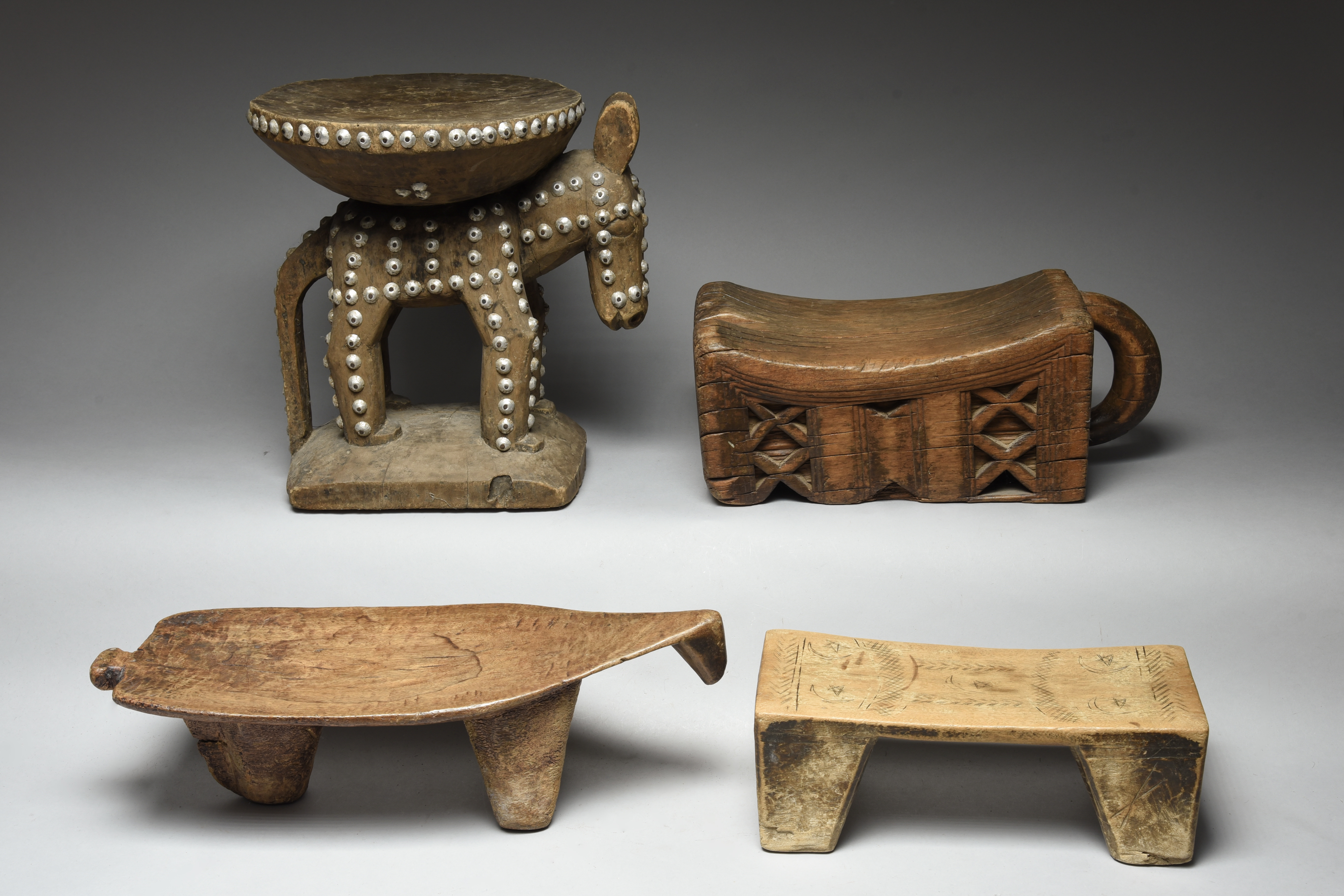 a West African stool, with a horse support and with aluminium studs, 33.5cm high, a Lobo zoomorphic tripod stool, 46cm long and an African stool, with incised crescent moon and star motifs, 31cm long.