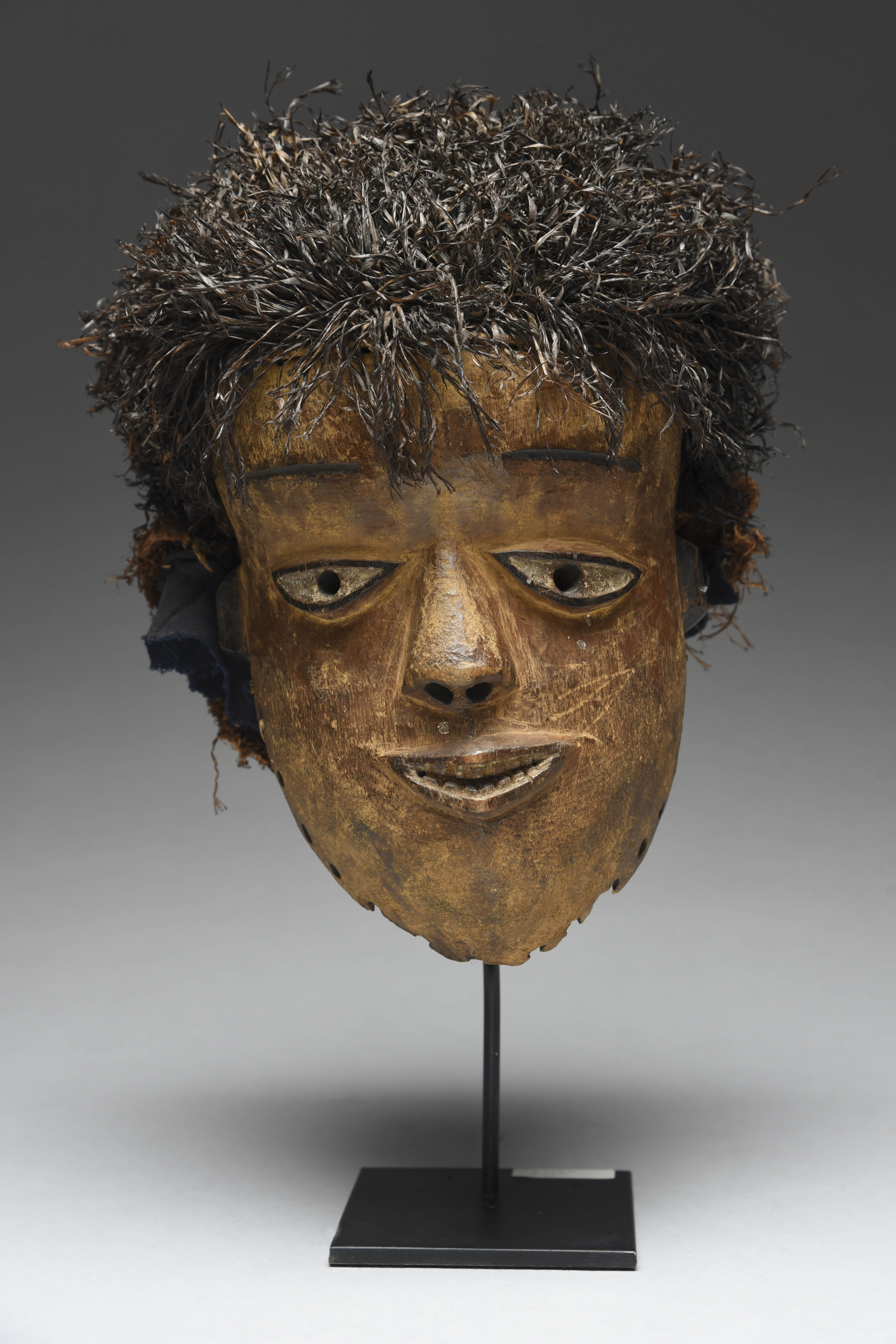 with an applied fibre coiffure and pierced eyes and nostrils and with bared teeth, with remains of a yellow and white pigment and with burnished details,