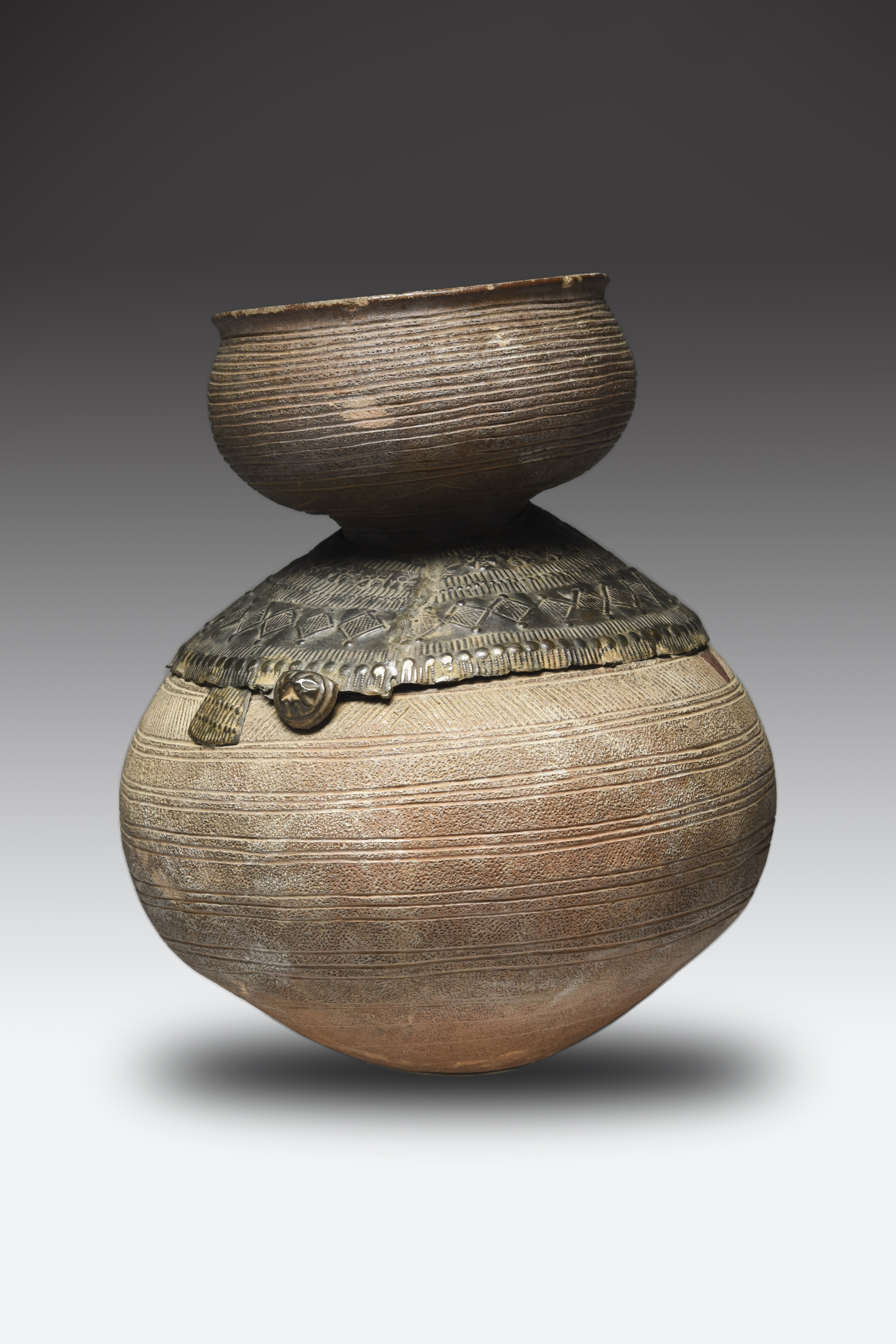 pottery, with incised linear decoration and an embossed sheet brass collar,