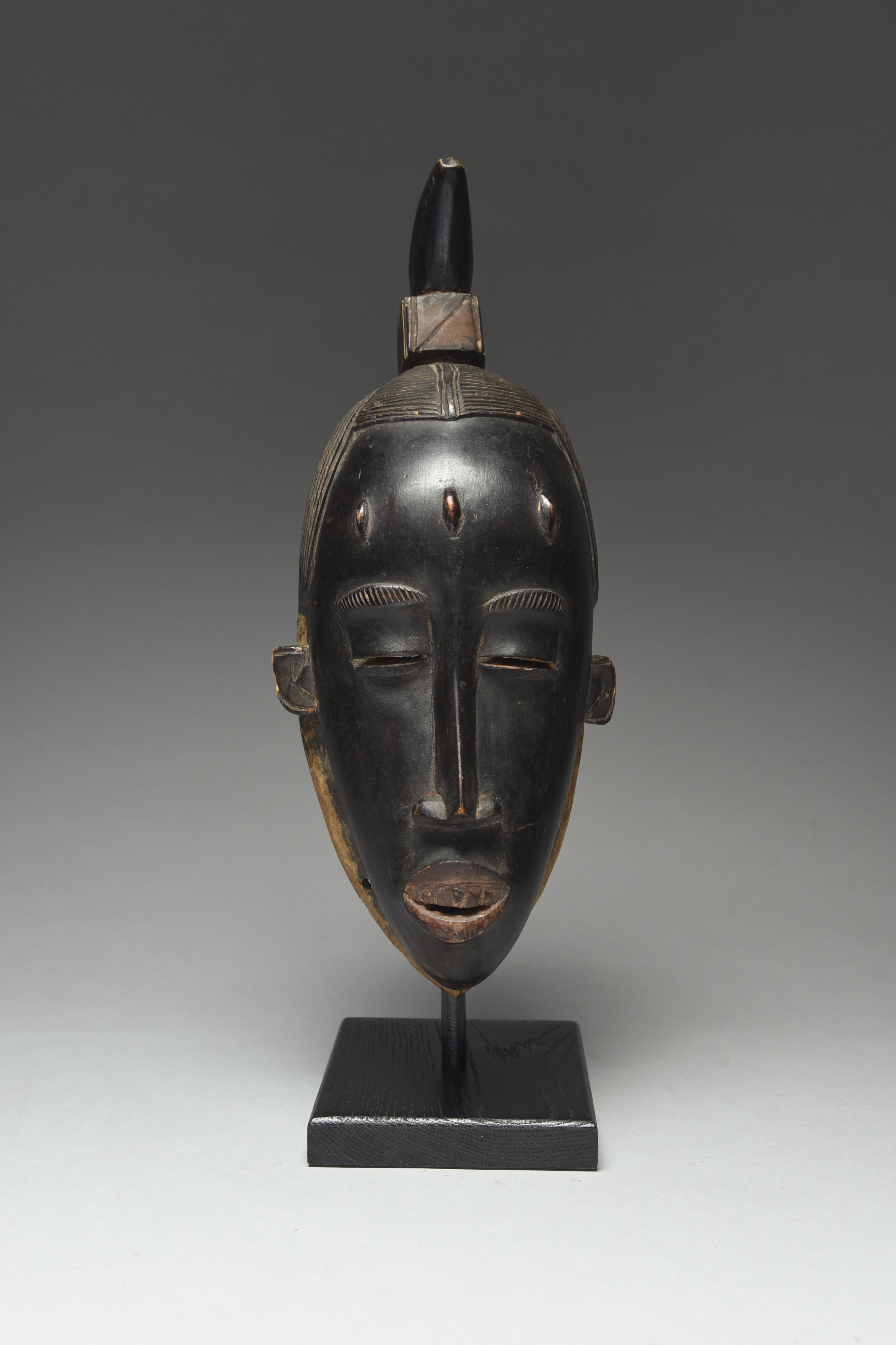 with a gathered up coiffure, three raised scarifications to the forehead, slit eyes and an open mouth with teeth, black and red paint,