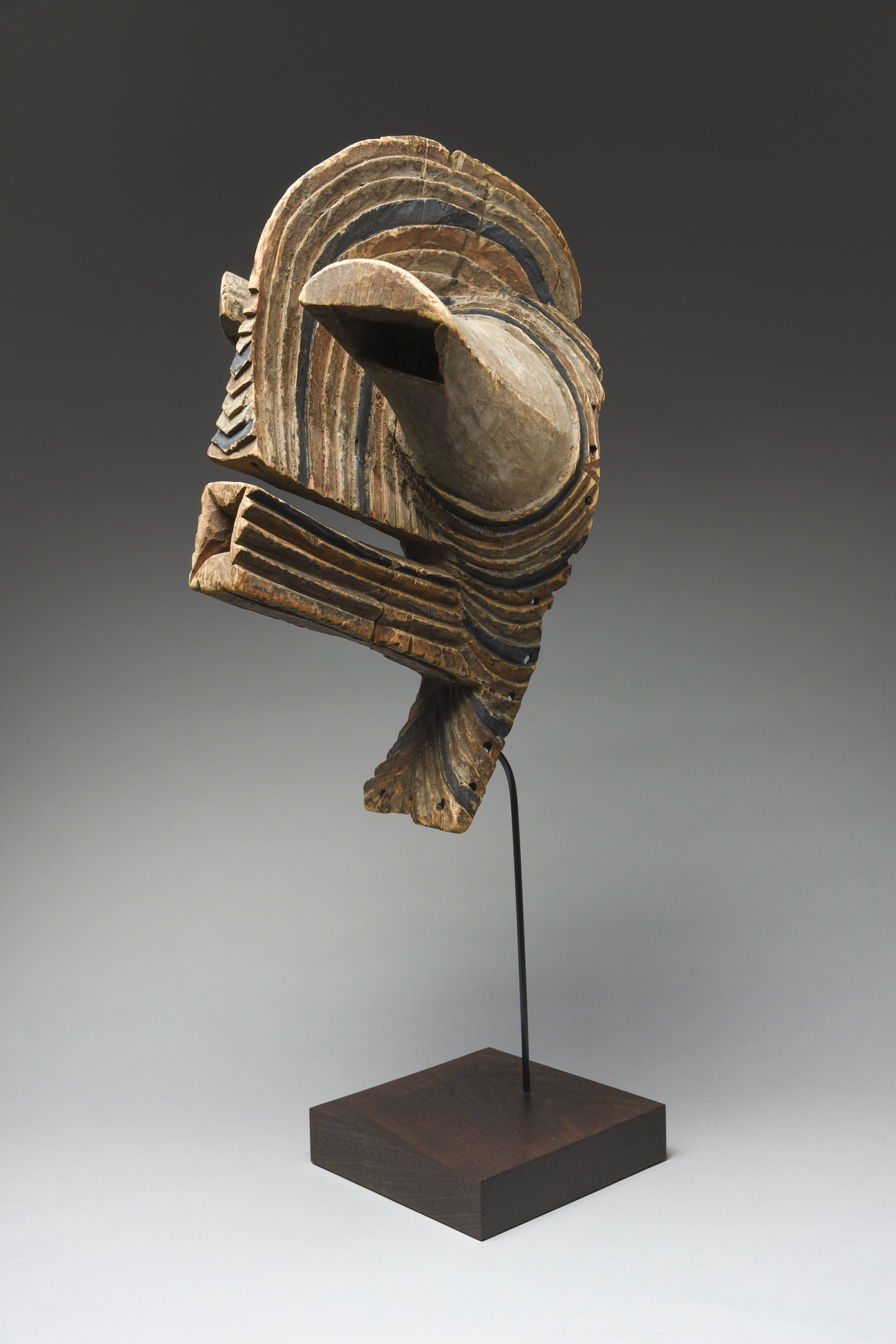 carved with elongated features and ribbed decoration with alternating pigments,