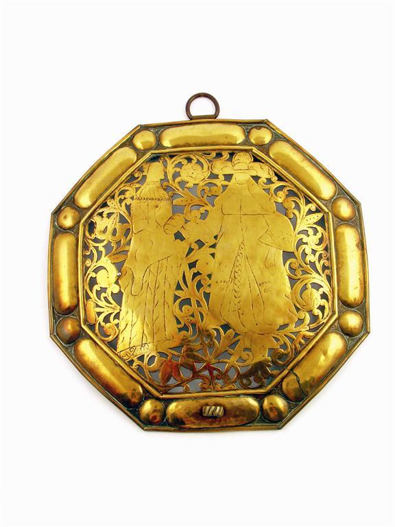A Dutch pierced and engraved brass octagonal wall sconce back plate