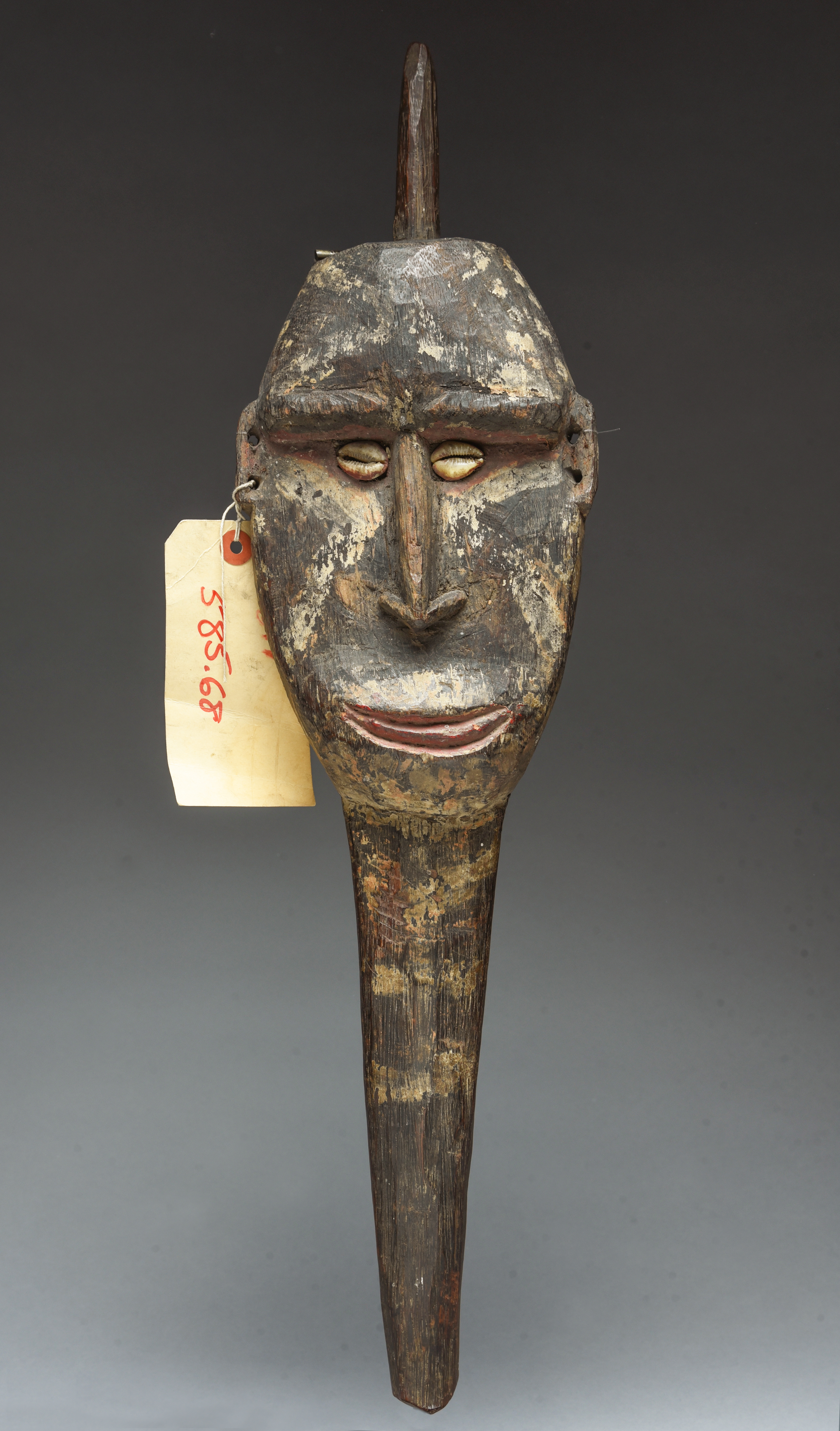 with an integral spike to the top of the head, with cowrie shell eyes and paint decoration, the back with a sticker inscribed 585.68 DN and a paper label inscribed DN 585.68,