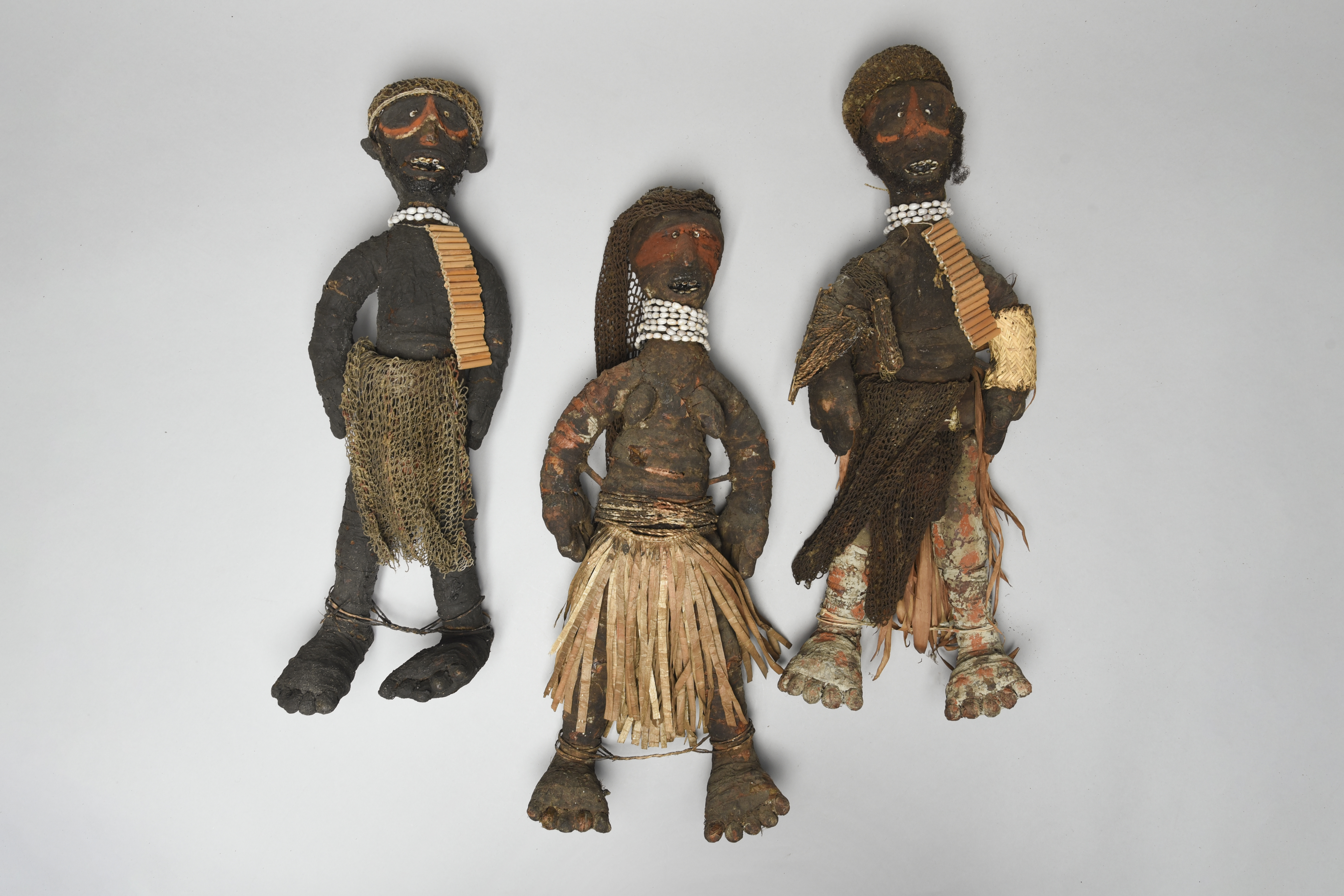 two males and a female, pandanus leaves, fibre, reeds, shells, seeds, hair and pigment,