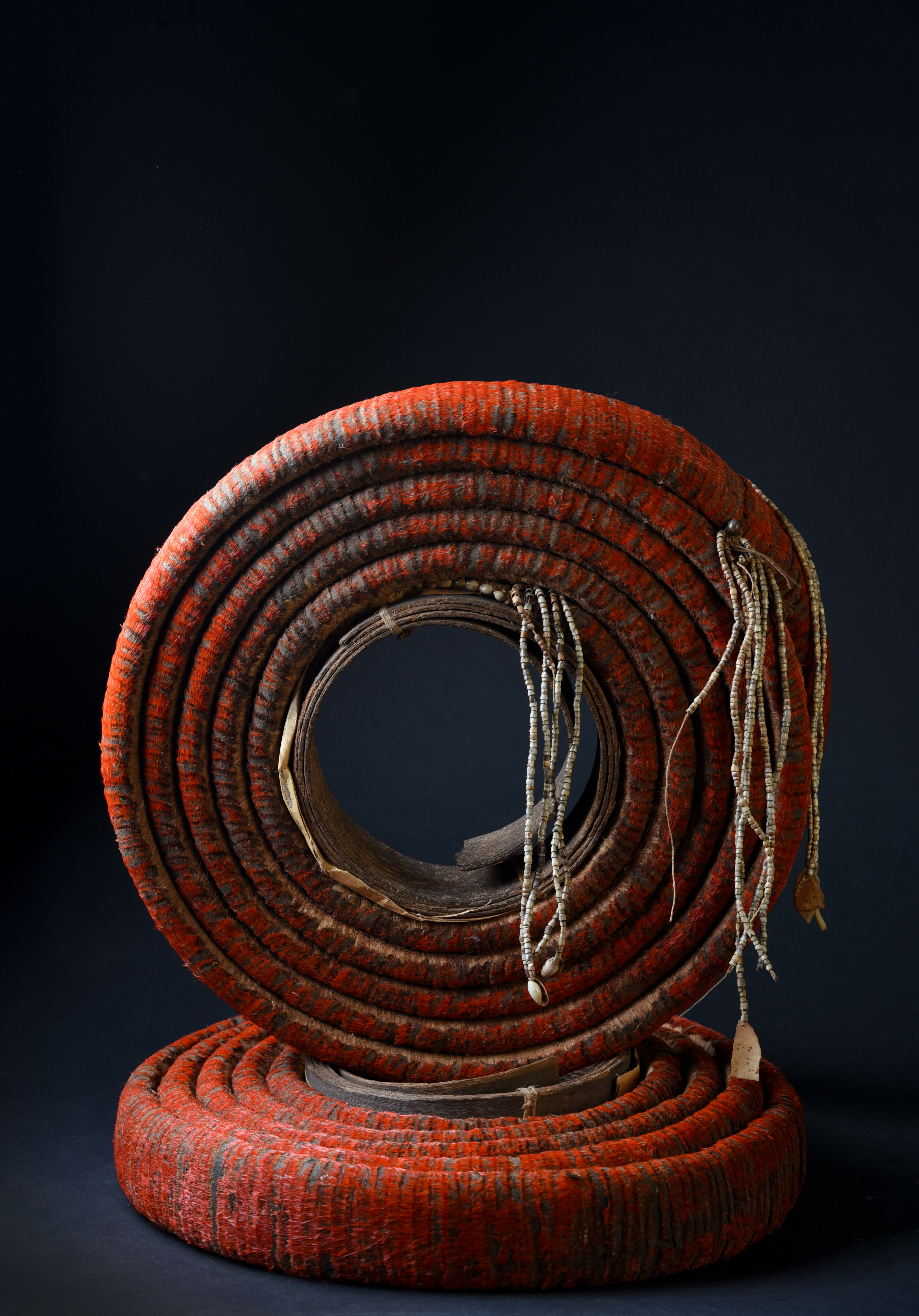 honeyeater bird feathers (myzomela cardinalis) on a fibre strip, the back of the centre with a woven chequer design, coiled into two rings with coiled bark and palm leaf, and hung with strands of coix seeds and shells,