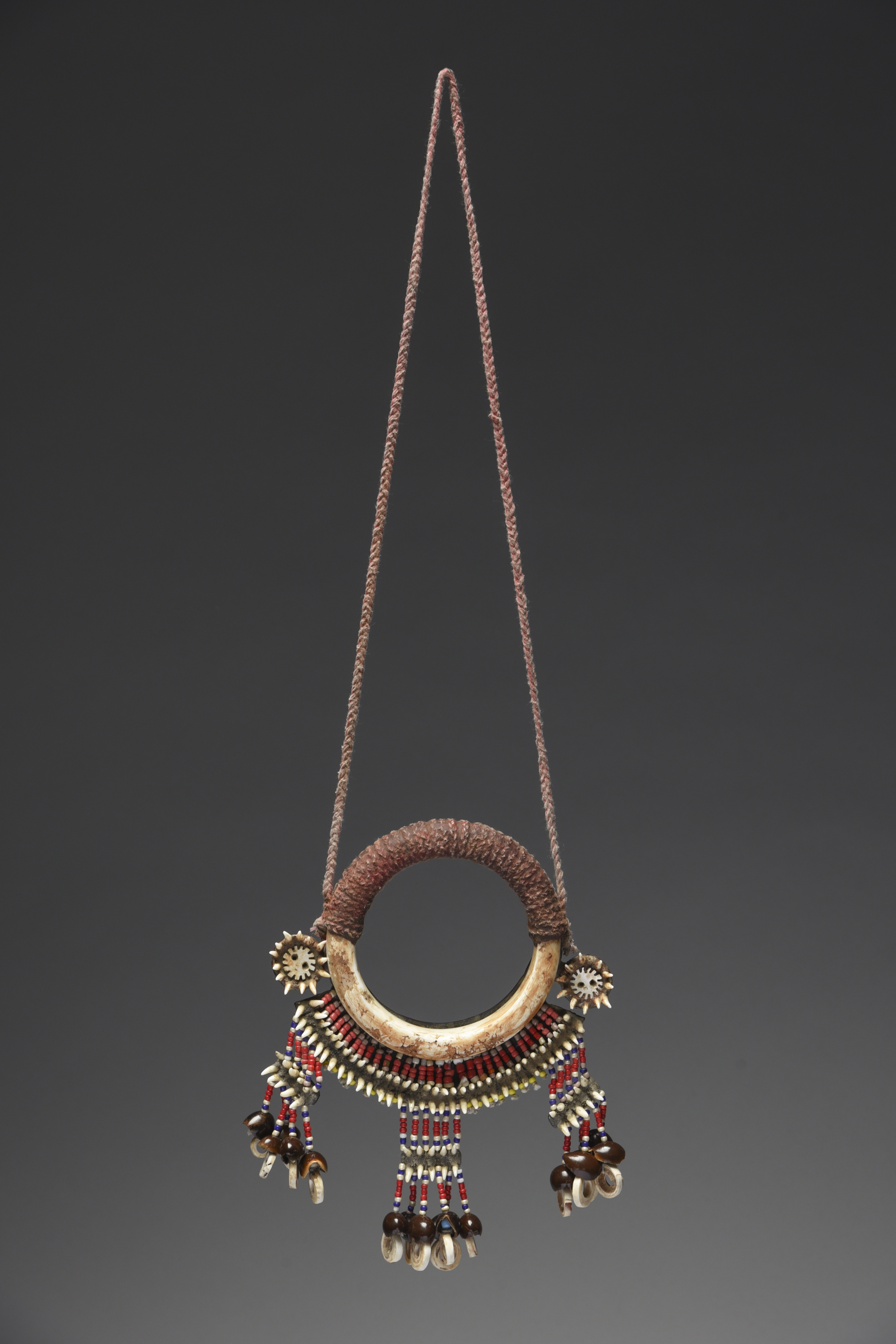 shell, fibre, coloured glass beads, teeth and seeds,