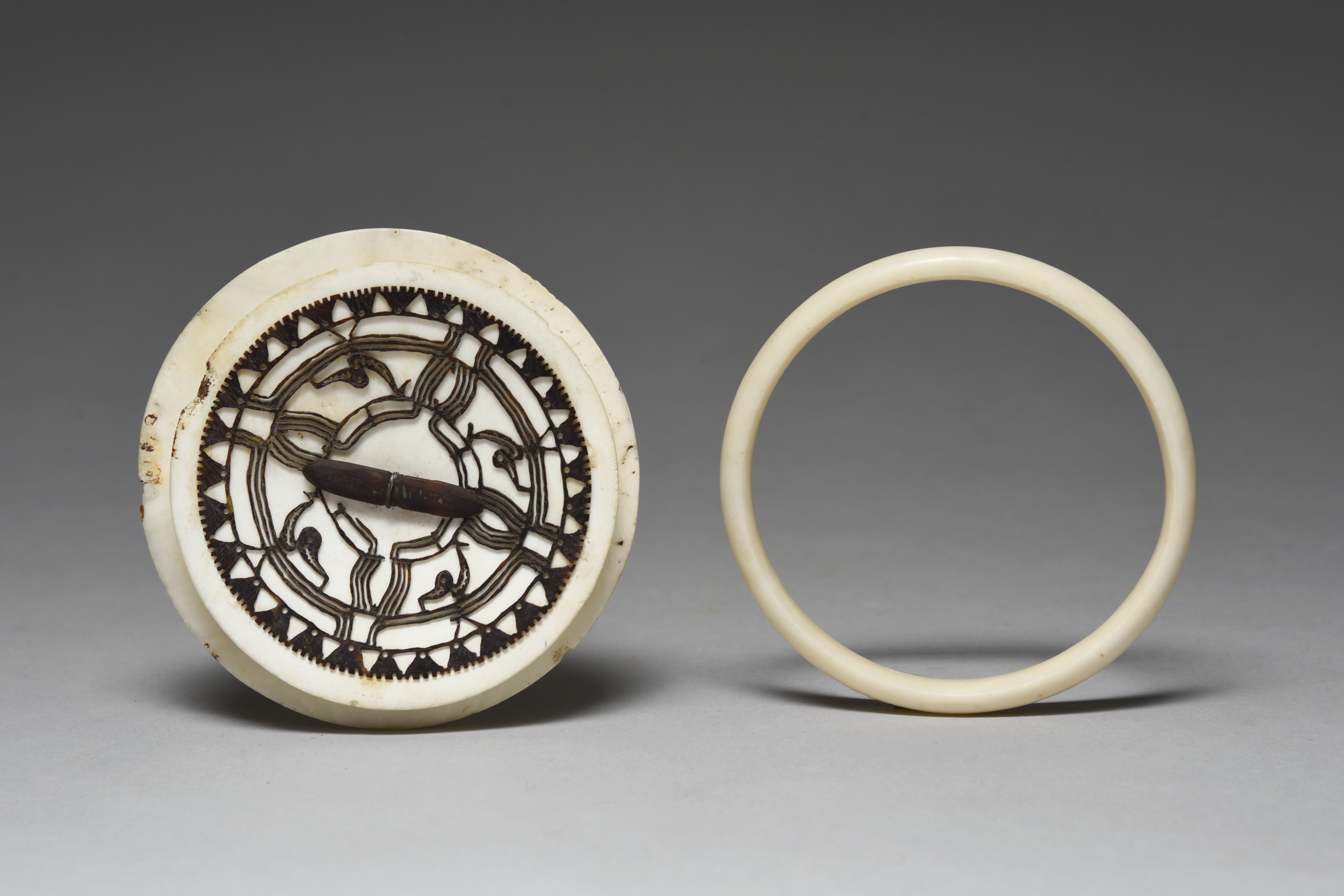 shell and turtleshell, worked triangles, lines and four frigate birds, mounted on two discs, and with a shell band,
