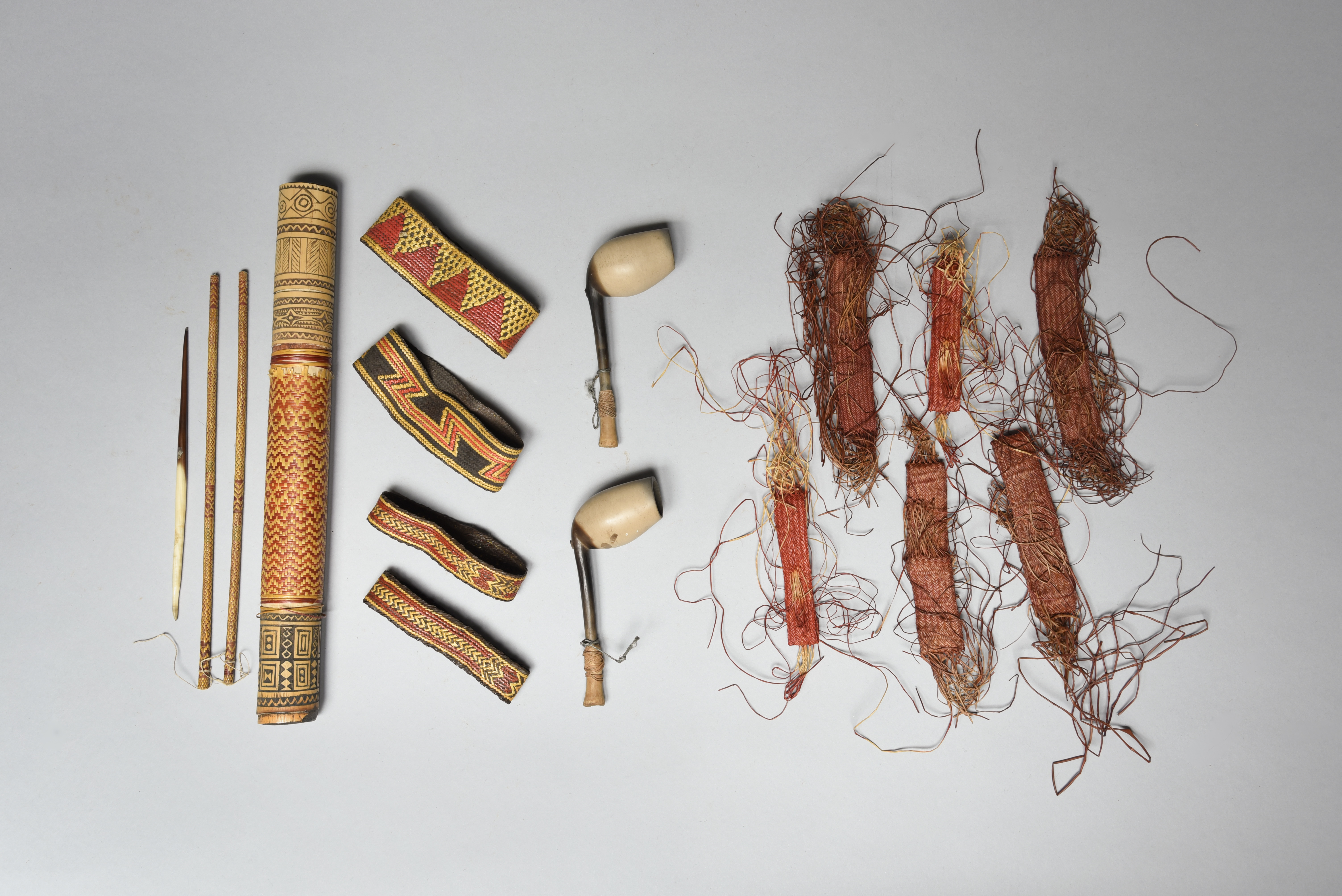 orchid fibre and red dye, two fibre ear ornaments, 25.5cm long, a quill nose ornament, 18cm long, a bamboo container and cover with carved decoration and fibre binding, 32.5cm long and two clay pipes with fibre bound wood mouthpieces. (17)