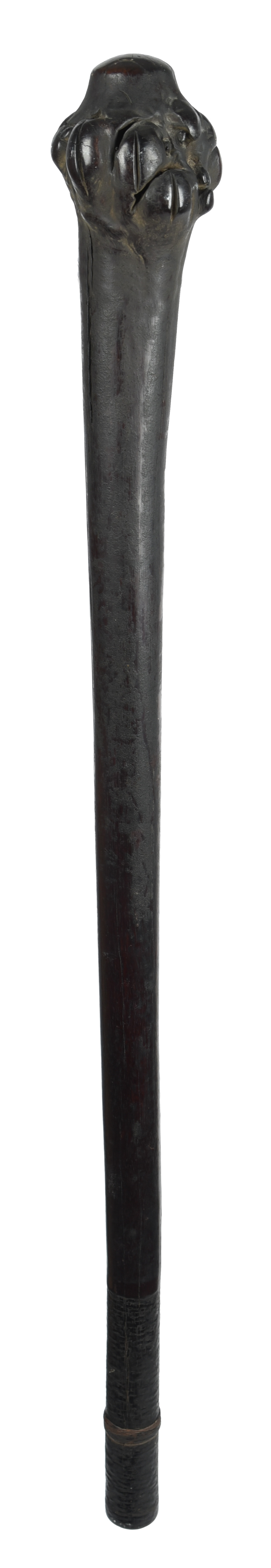 with a worn root ball head to a tapering shaft with a worked grip having the remains of a fibre binding,