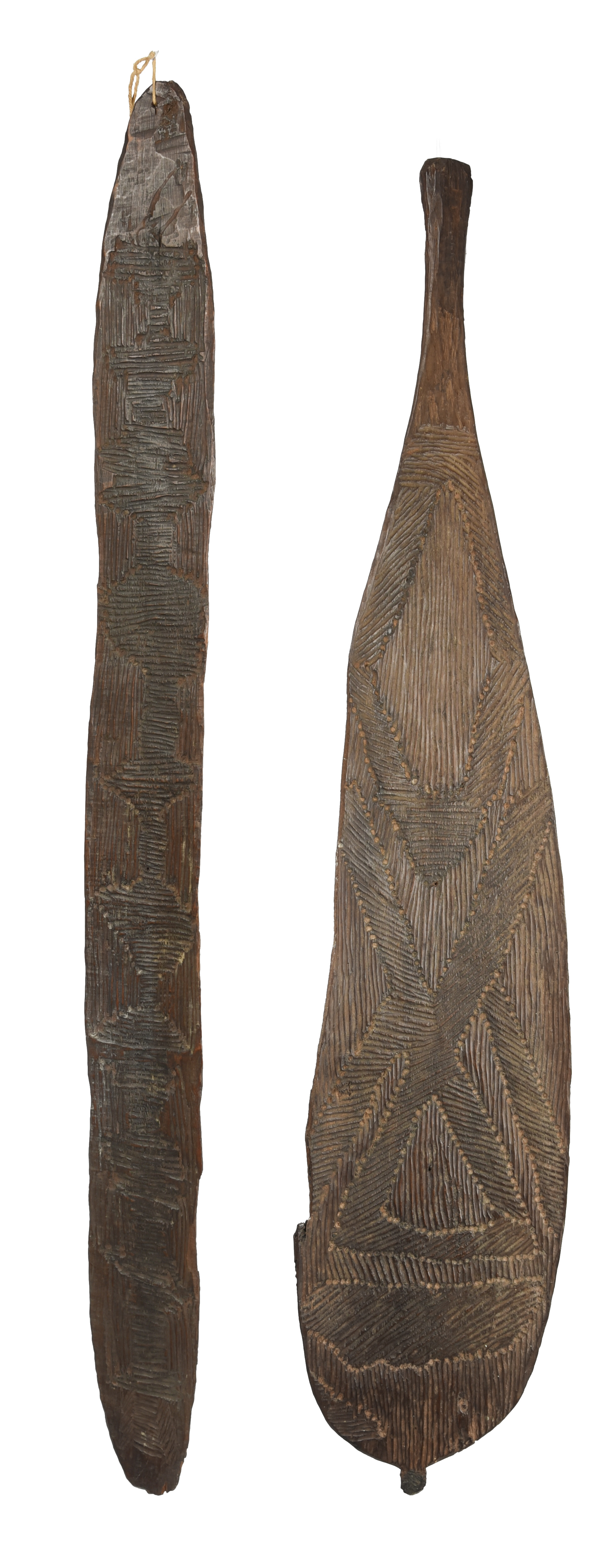 and an Aboriginal spear thrower woomera, with carved stylised channeled linear and dot decoration, with a textured back, 77.7cm long. (2)