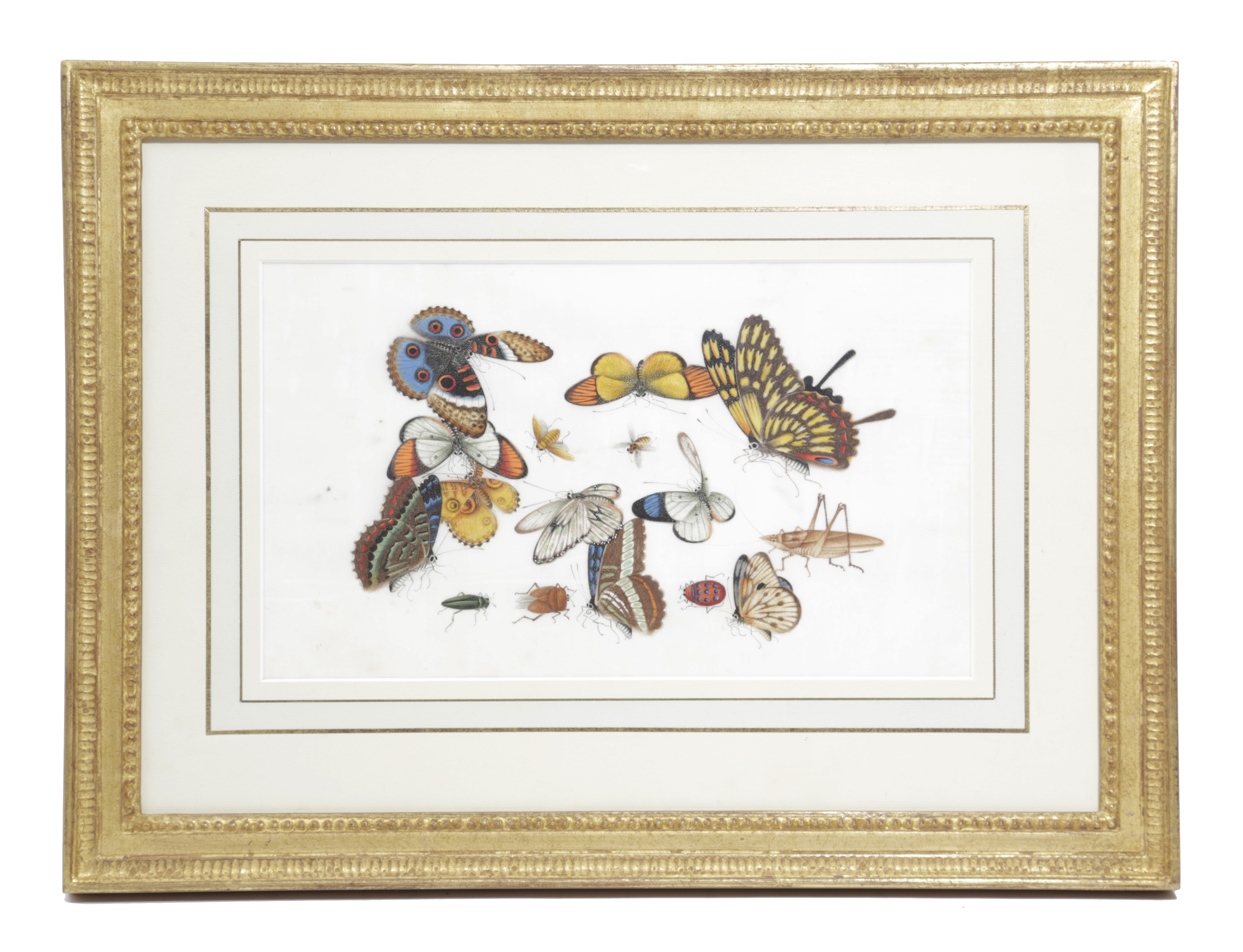 depicting a variety of butterflies, moths and other insects; together with another pair of bouquets of flowers, in glazed giltwood frames (4)