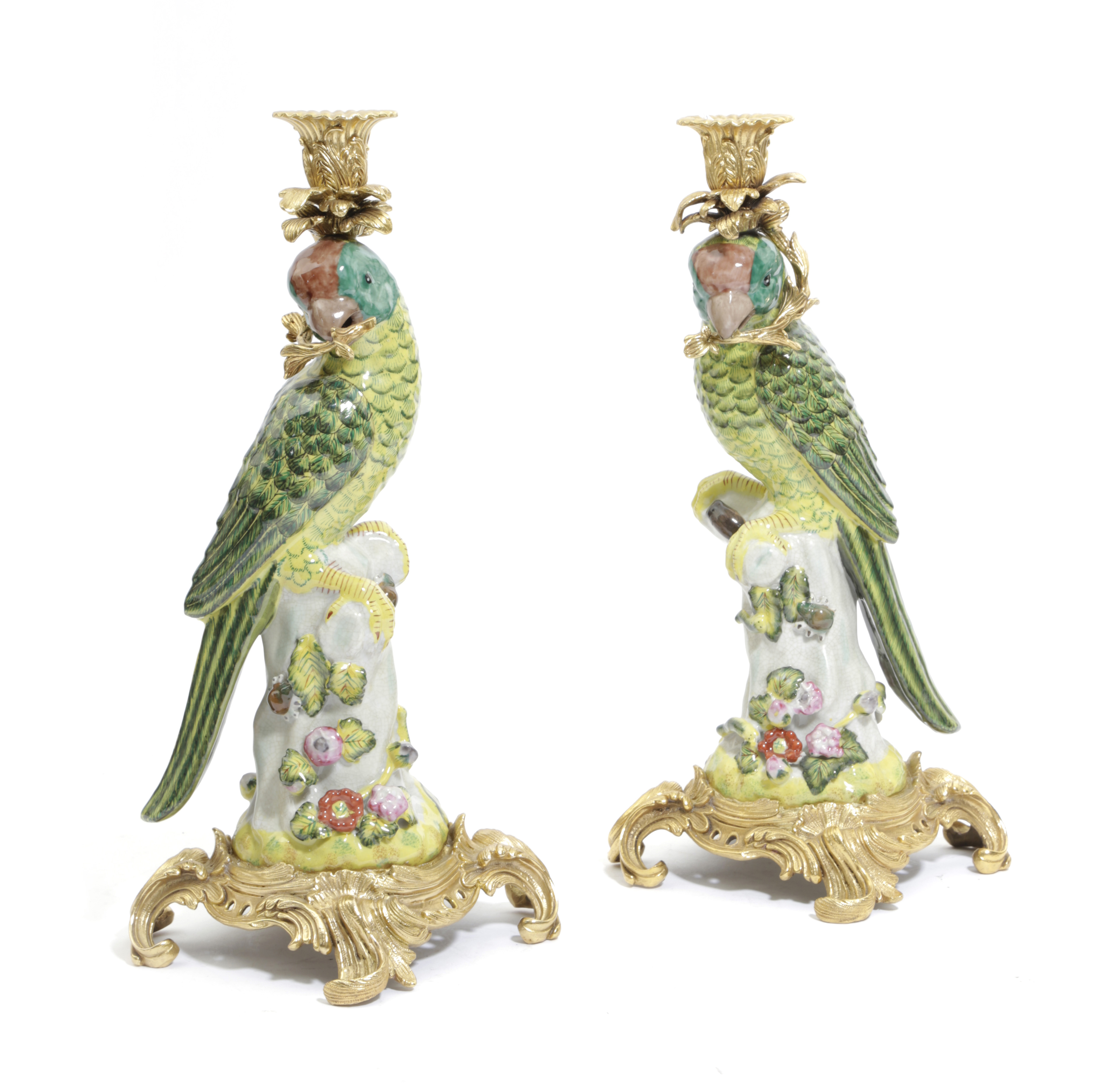 A PAIR OF CONTINENTAL POTTERY PARROT CANDLESTICKS