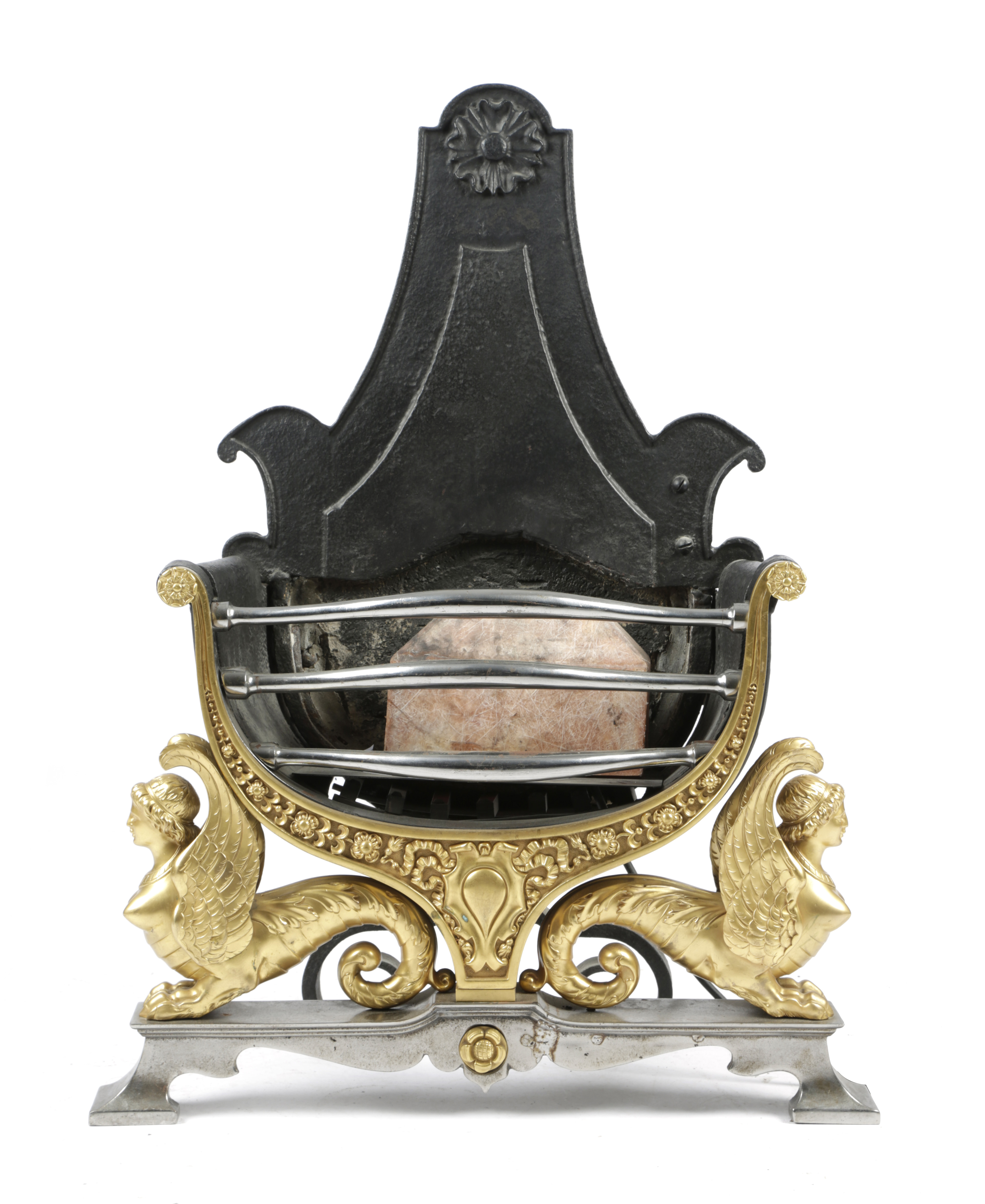 the shaped back centred with a rosette, above a steel railed basket, supported by a pair of Egyptian sphinx