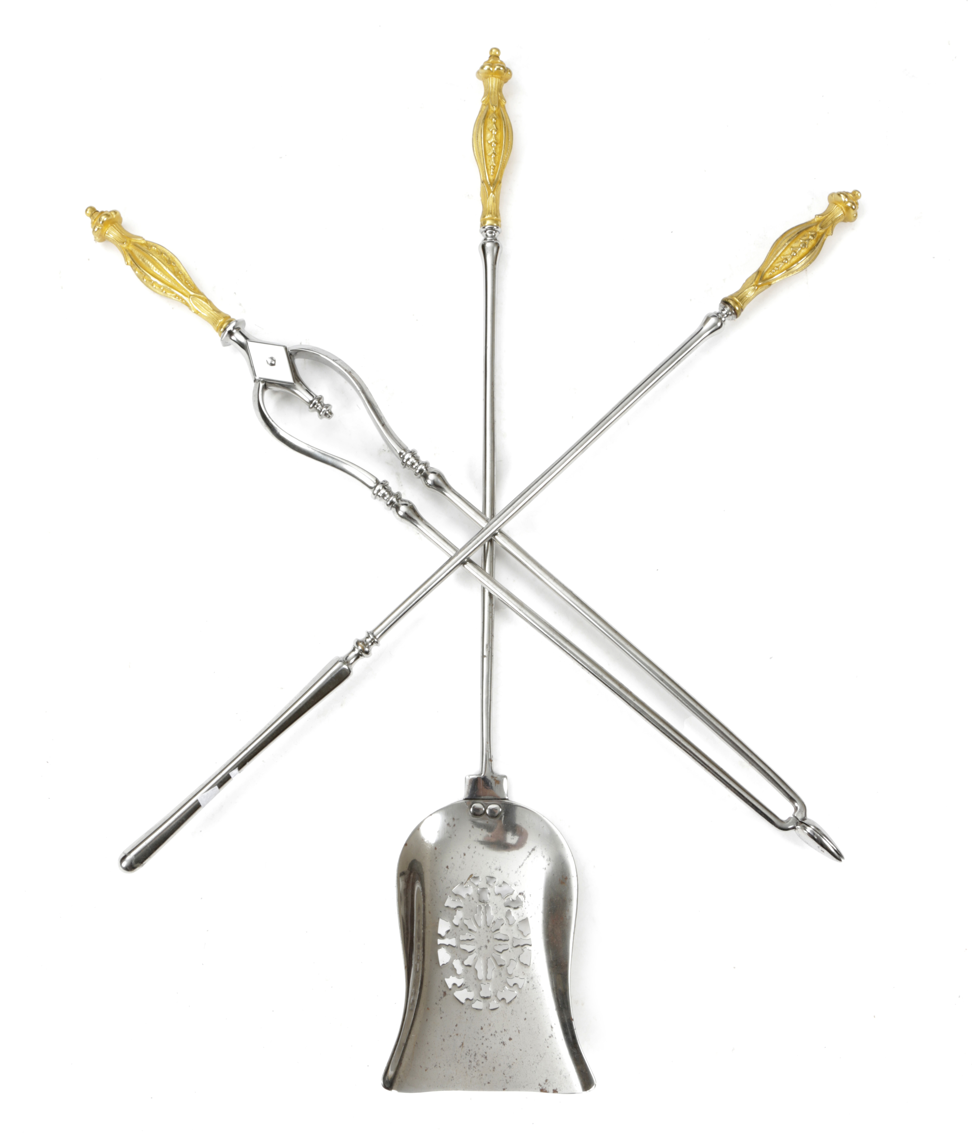 A SET OF THREE POLISHED STEEL AND GILT FIRE IRONS