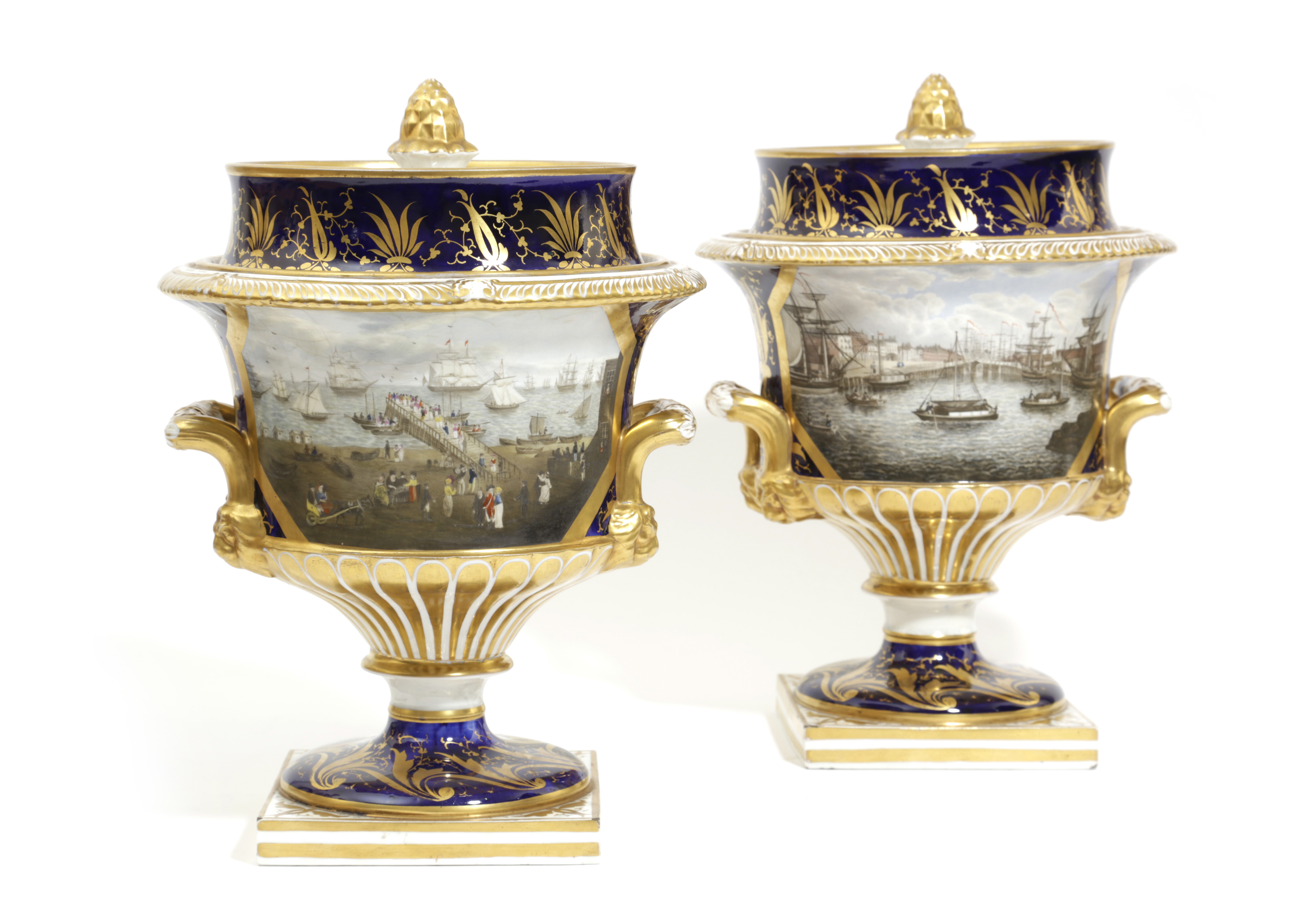 painted with views titled 'A North West View of the Quay of Great Yarmouth' and 'A. N. W. View of the Jetty at Yarmouth', from engravings by Robert Pollard after J Butcher, in canted gilt cartouches, the reverse decorated with musical devices, on a deep blue ground with gilt foliage, the rims with grey marbling, between a pair of handles with lion masks, on socle stems and square feet, the covers with cone finials, iron red inscription and view titles (2)