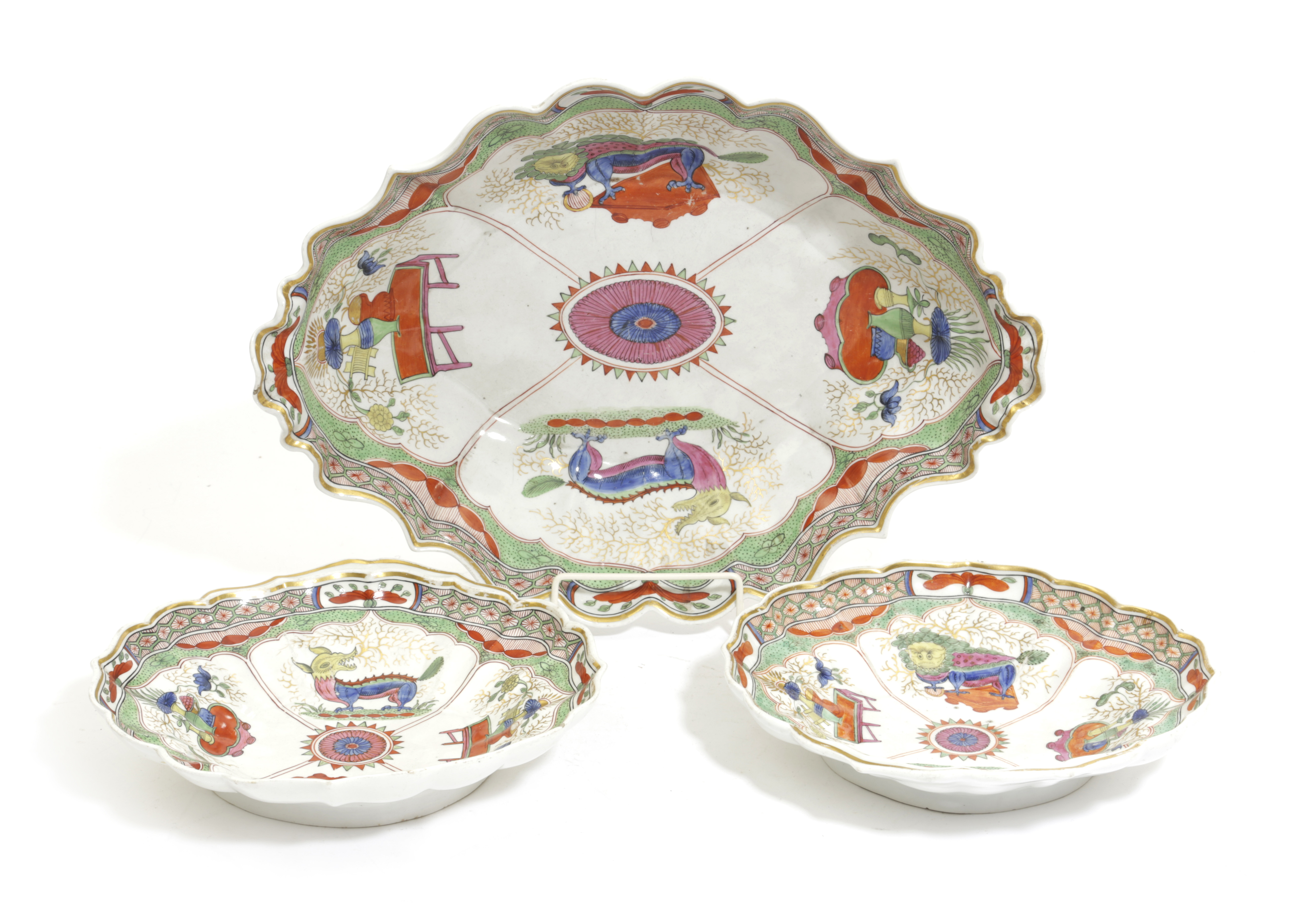 of lozenge form, painted in the 'Dragons in Compartments' pattern, with puce painted marks, together with a pair of shell shaped dishes in the same pattern, probably Chamberlains (3)