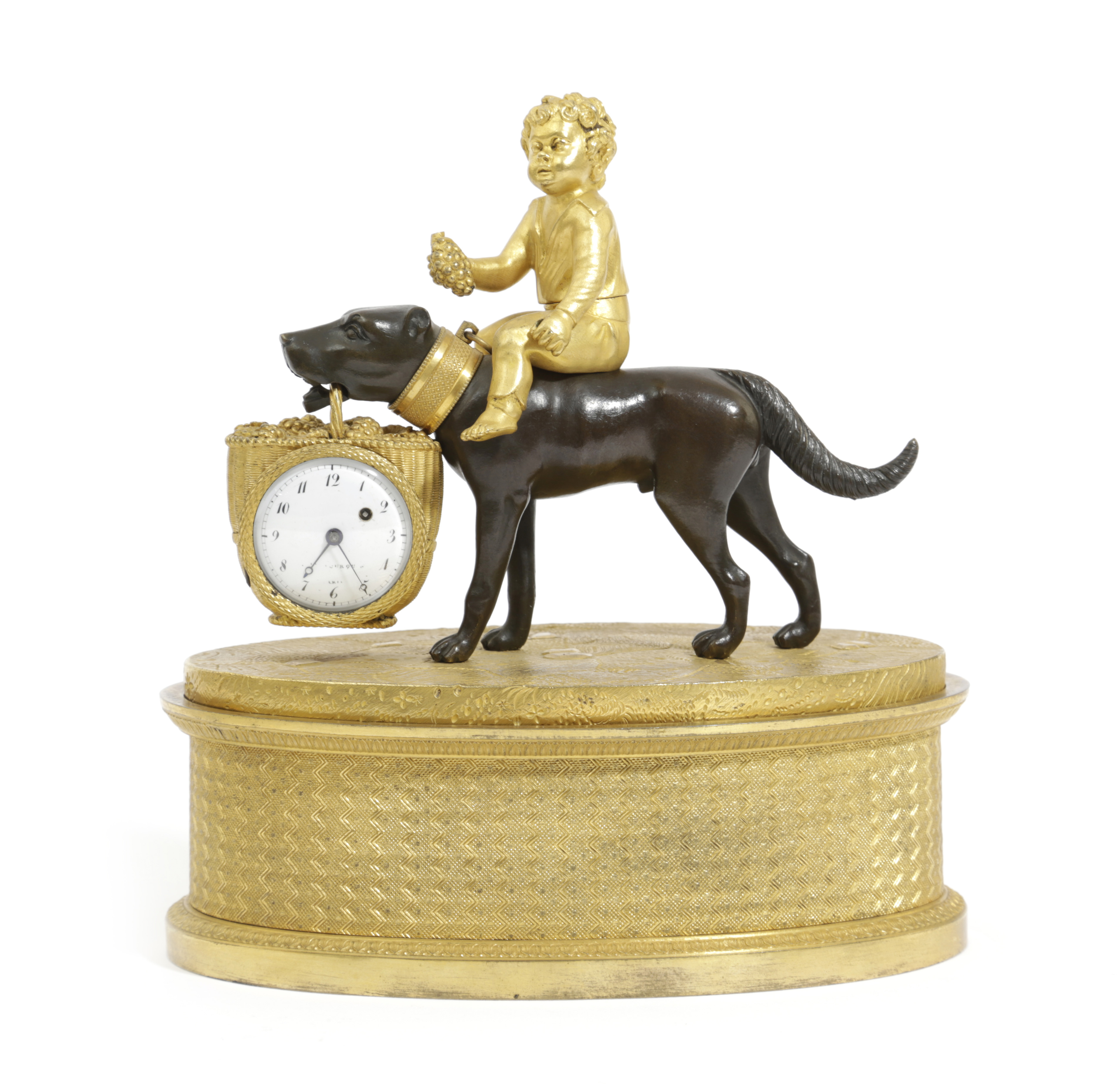 modelled as a child sat astride a dog carrying a basket of grapes in its mouth and fitted with a French clock with a brass pocket watch style movement inscribed 'Adm. Bourquin A Paris' and enamelled dial, on an oval base with two inkwells, pounce pot, four pen holders and a well, the exterior with engine turned decoration, with a key