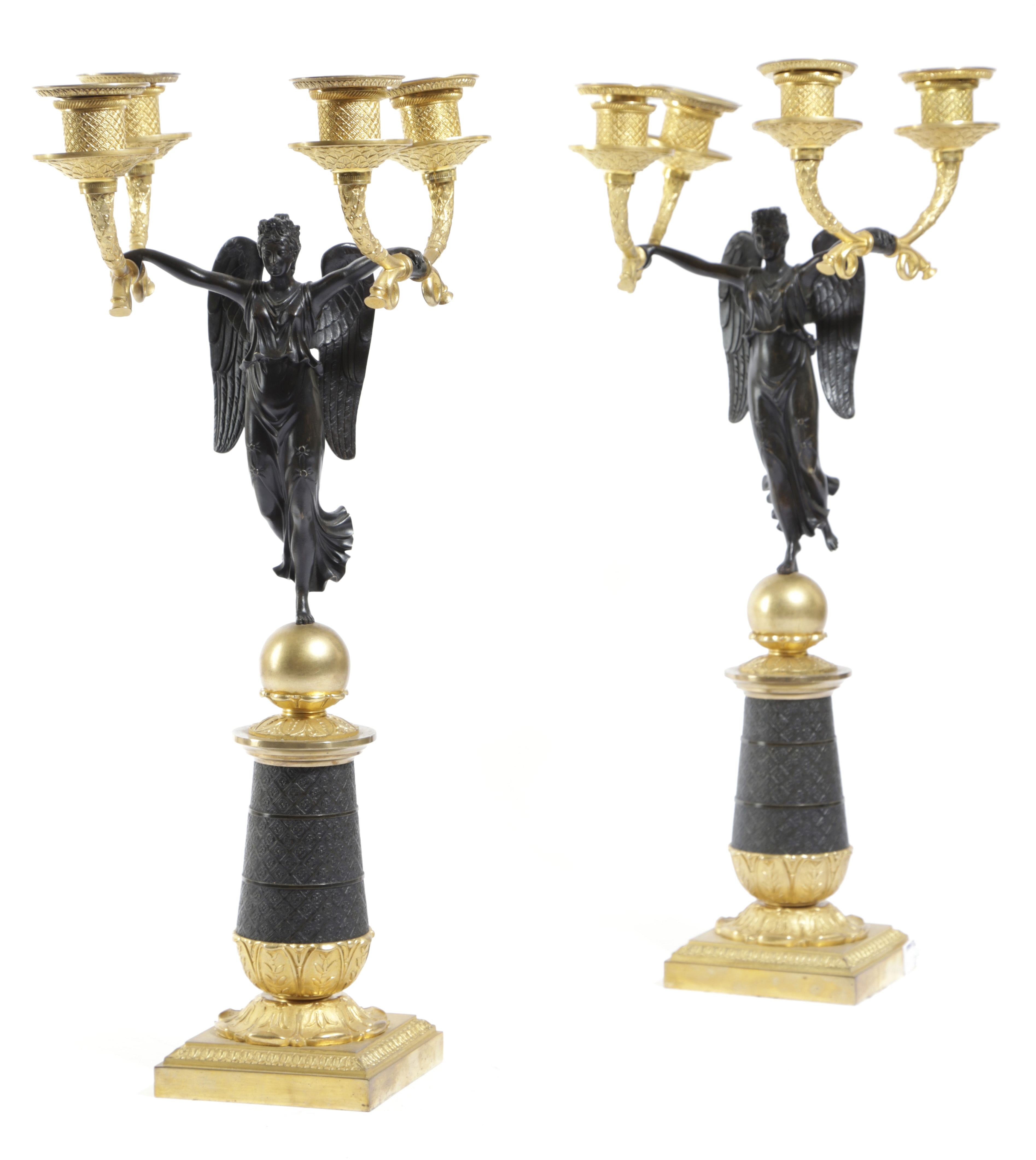 A PAIR OF FRENCH EMPIRE GILT AND PATINATED BRONZE FIGURAL CANDLESTICKS