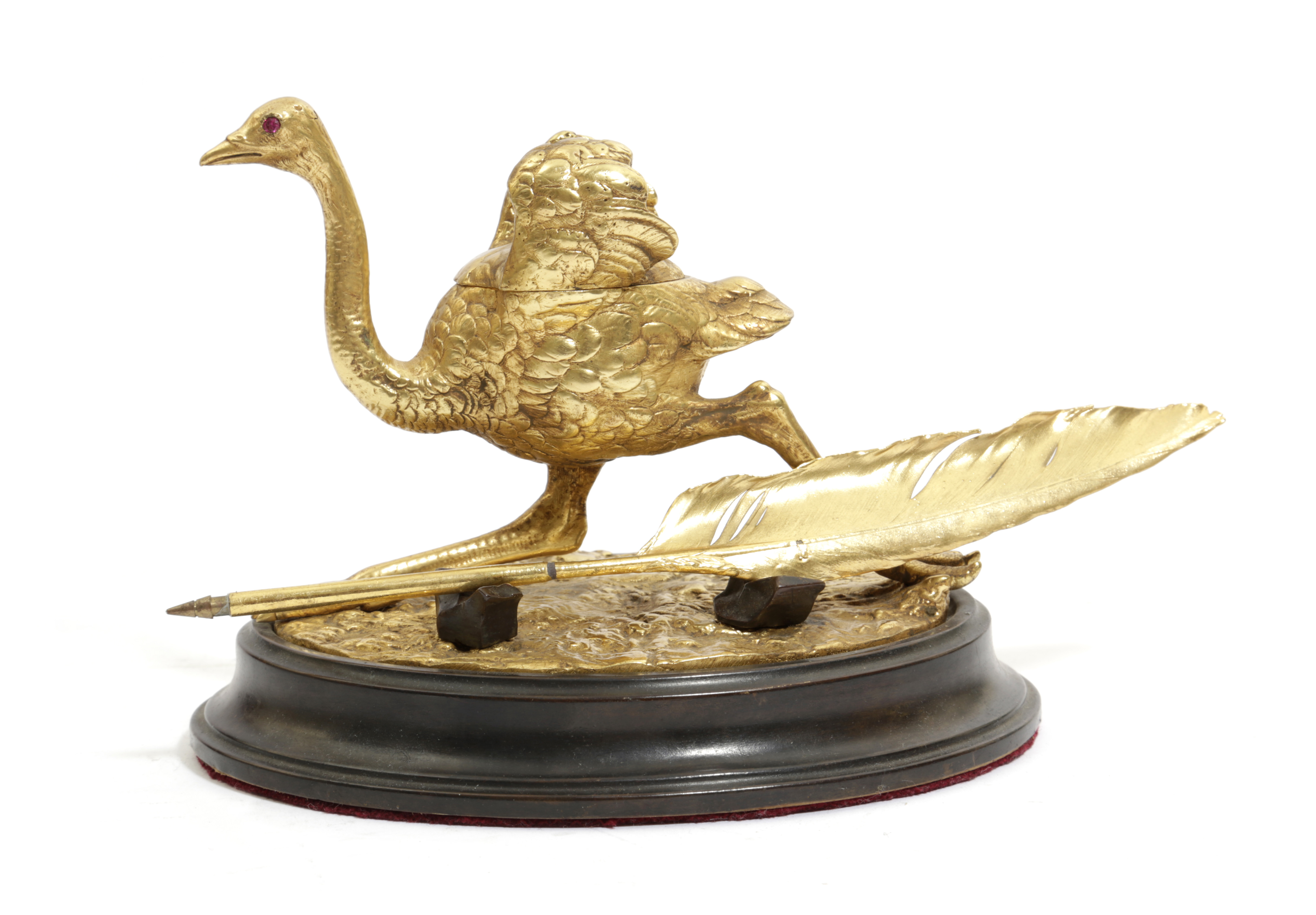 A NOVELTY GILT BRONZE OSTRICH INKWELL