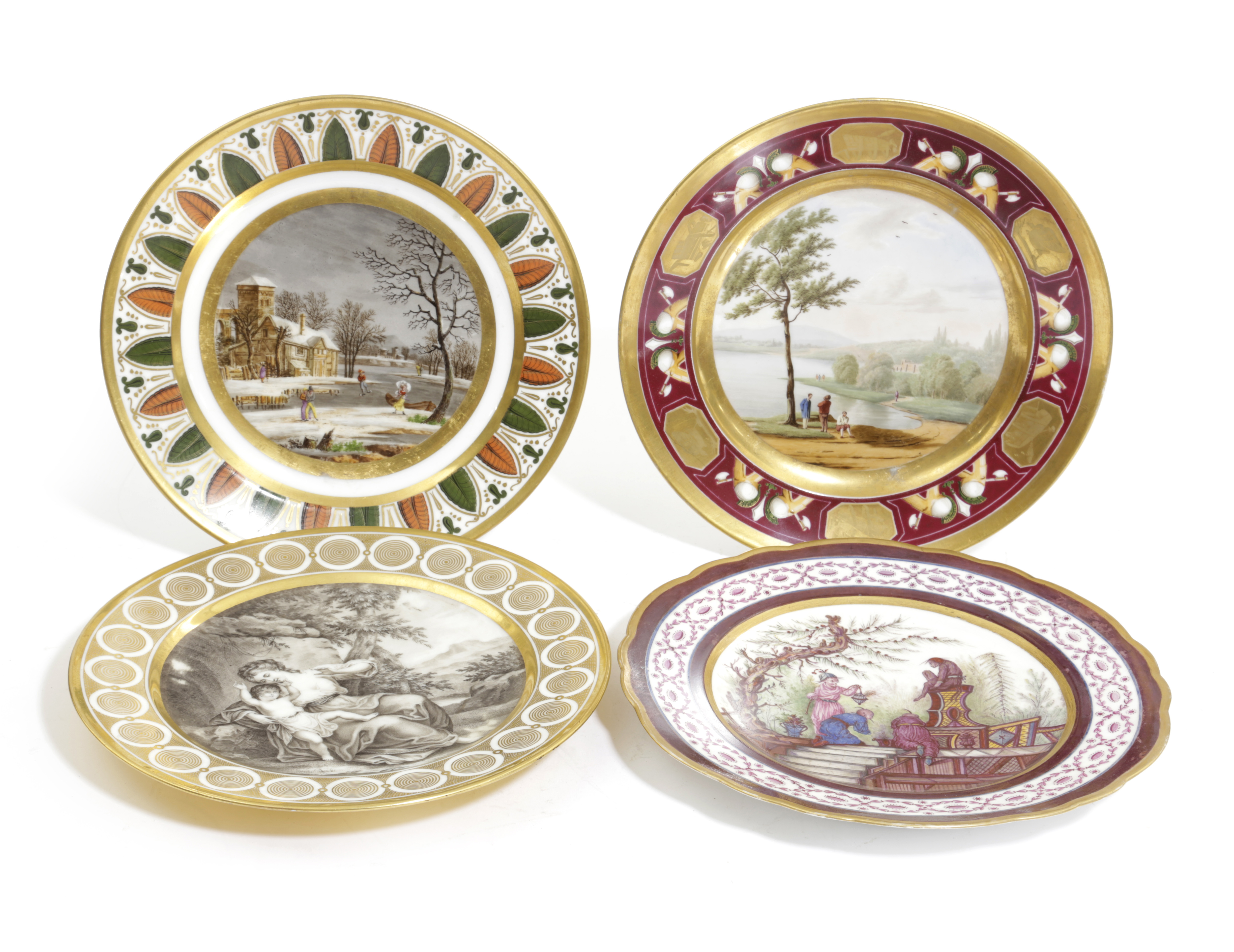 including one painted en grisaille with a classical mother and child, another with an ice skating scene, one with a chinoiserie scene and another with a lakeside scene (4)