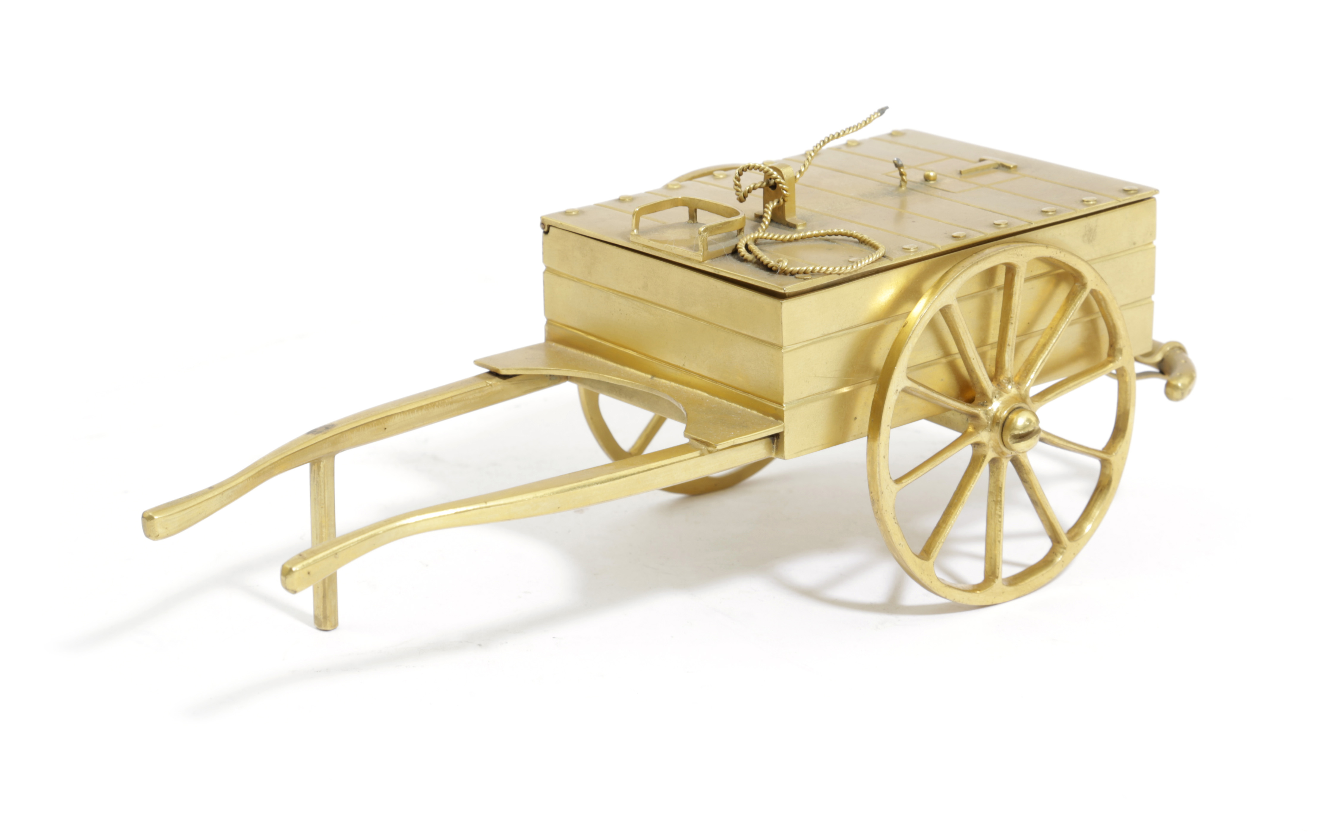 A GILT METAL MODEL OF A TWO WHEELED CART