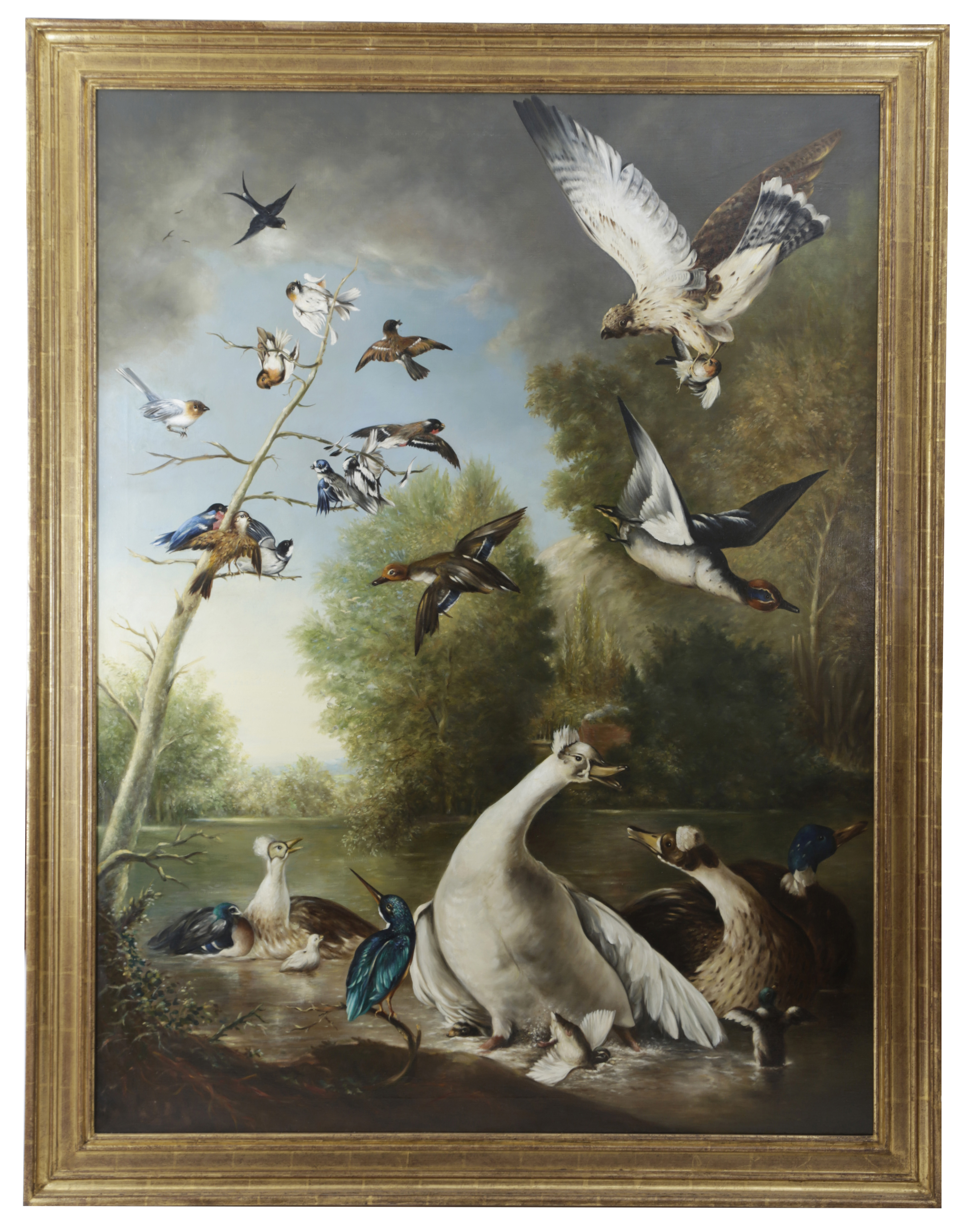 Φ A LARGE OIL PAINTING OF BIRDS AND WATER FOWL