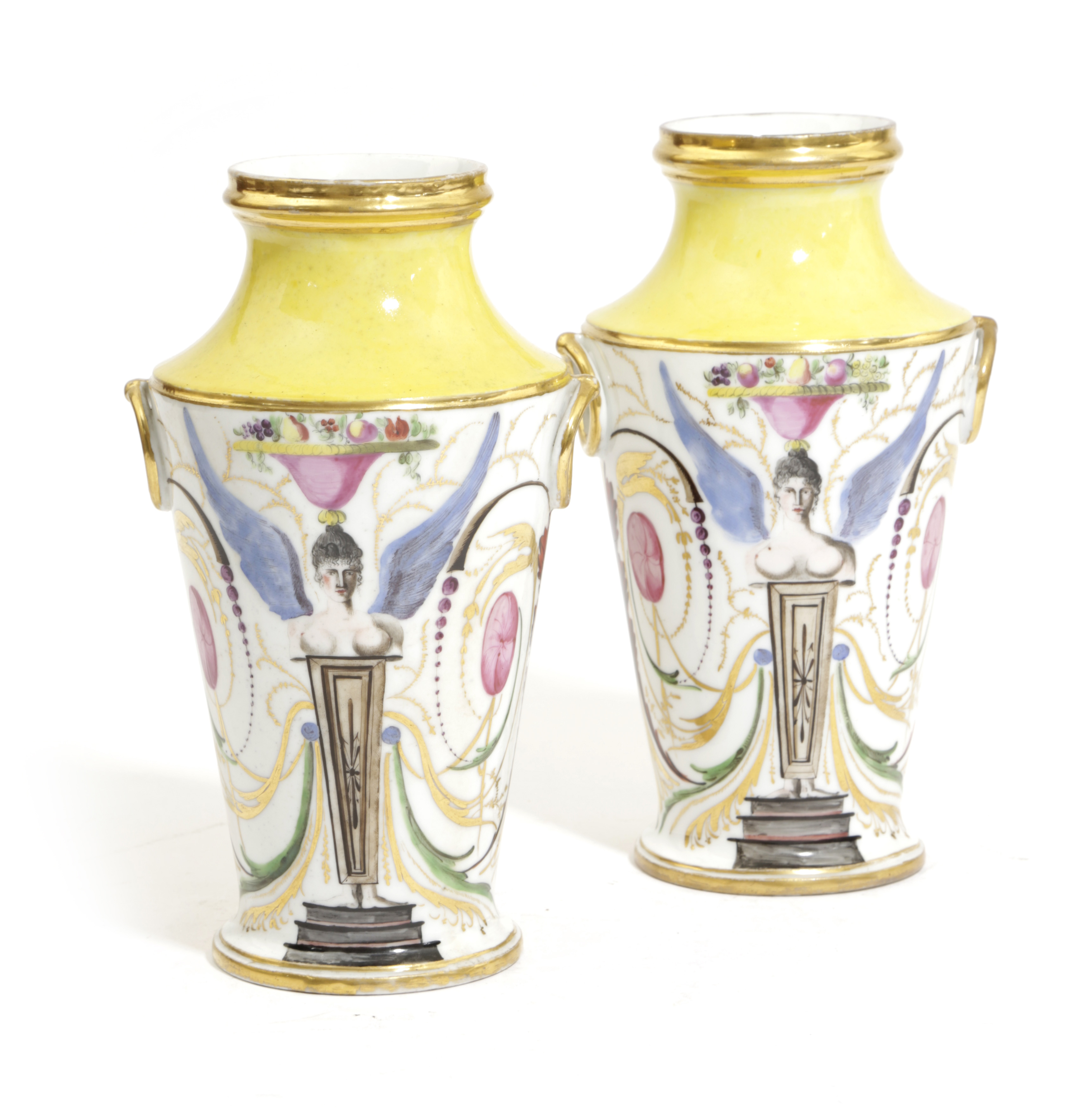 each of shouldered form, painted with classical female busts on podiums, surrounded by paterae and swags, beneath a yellow and gilt neck and ring handles (2)