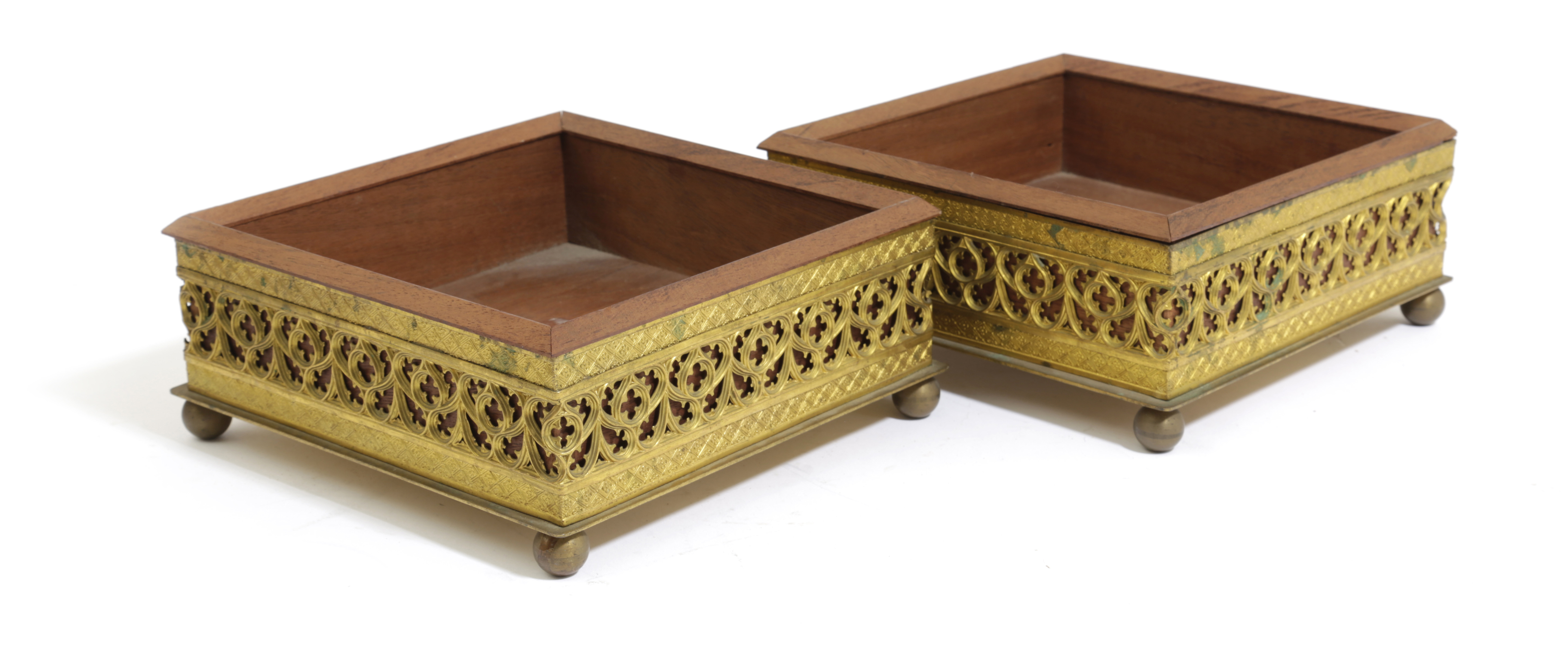 of square form, with pierced Gothic tracery between flowerhead diaper borders, on ball feet (2)