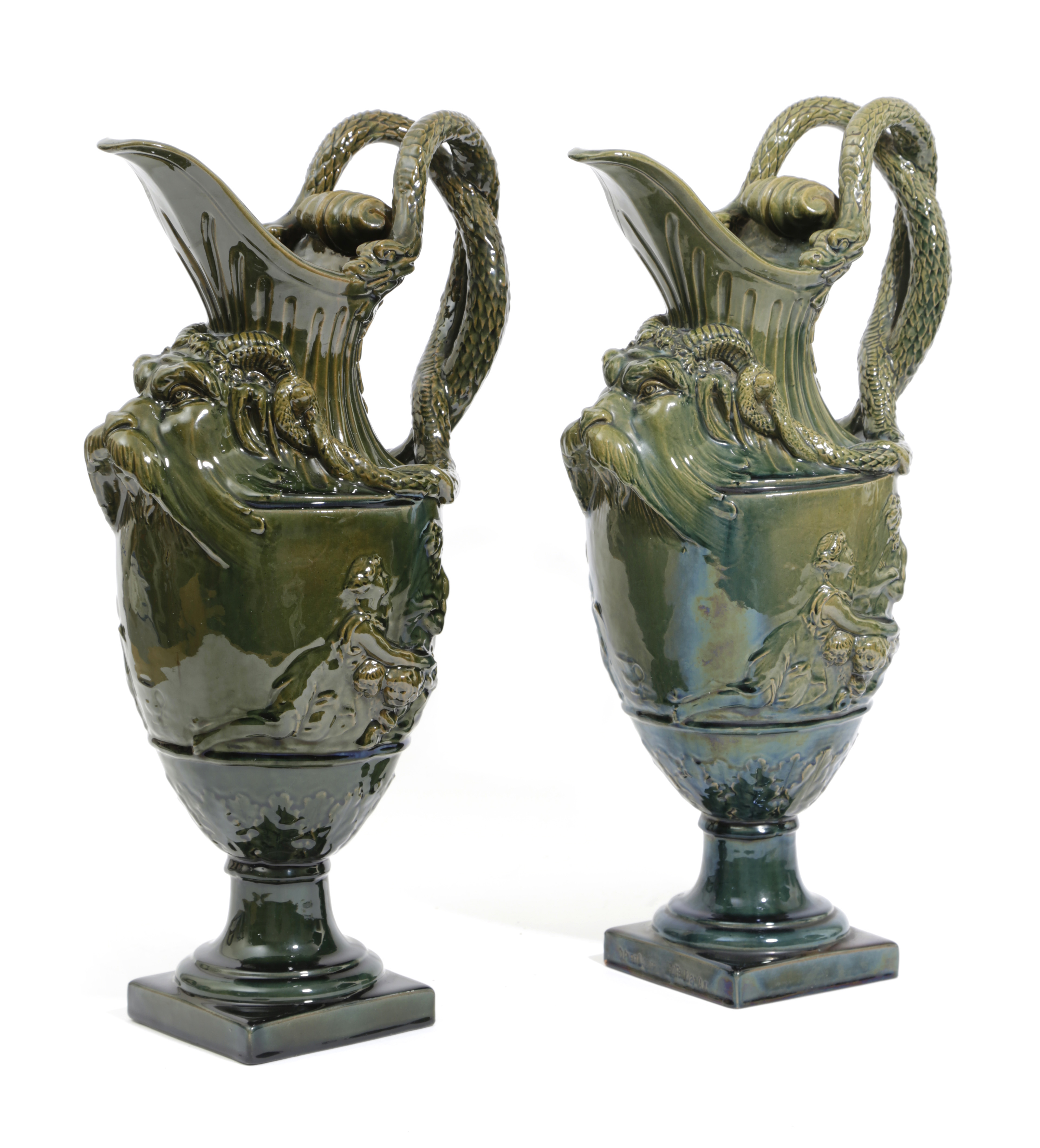 with a streaky green glaze, each with Bacchanalian scenes beneath a mythical beast mask, the handles in the form of two entwined snakes, on socle bases and square feet, one stamped Clement Massier Golfe Juan (AM) to the foot rim (2)