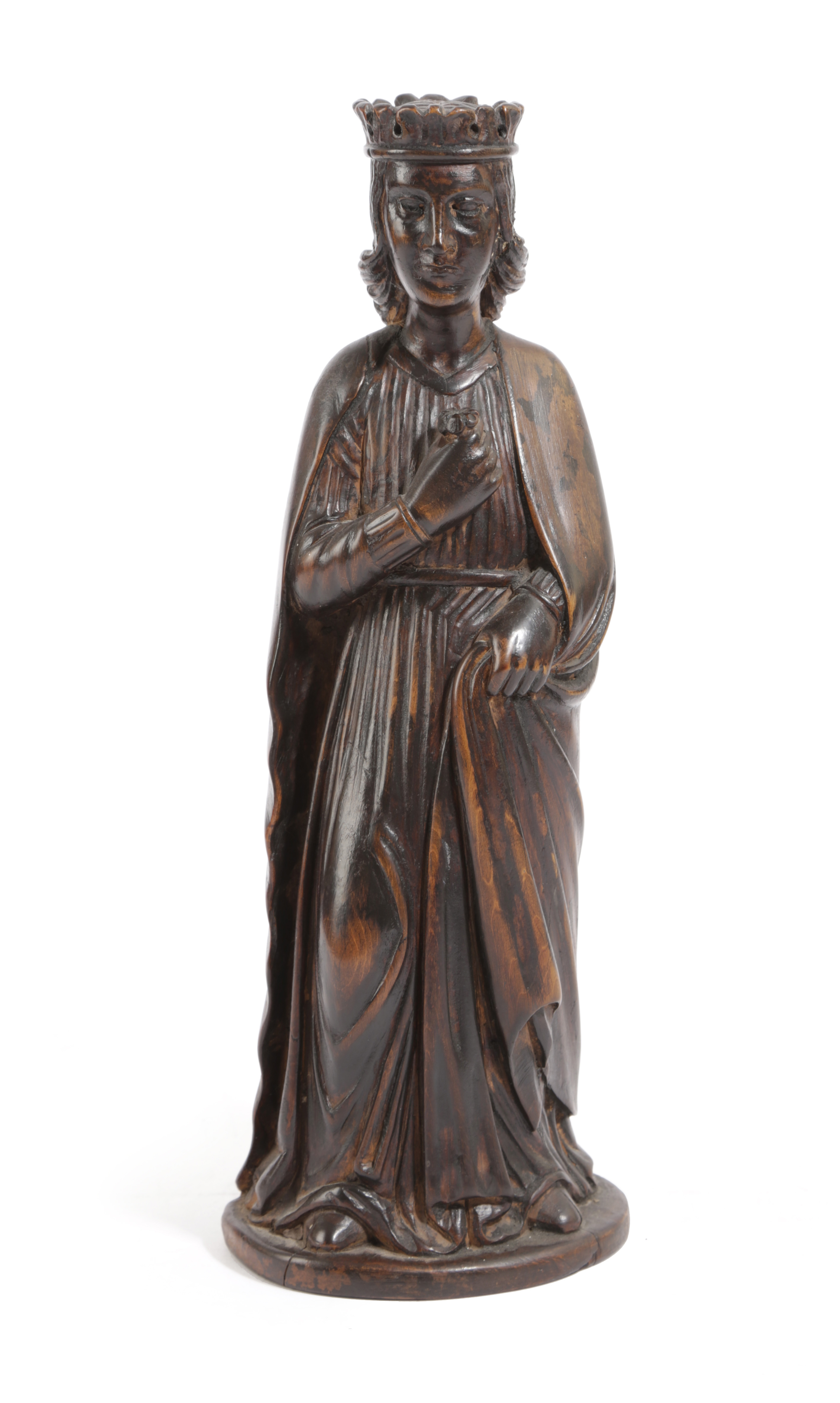 A NORTH EUROPEAN CARVED WALNUT FIGURE OF A FEMALE SAINT